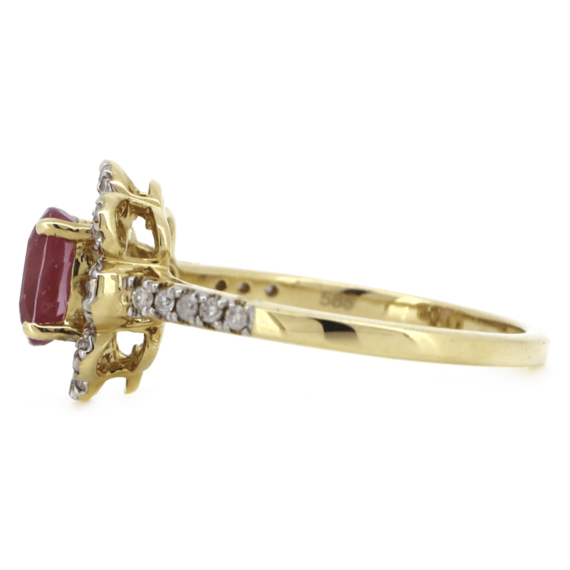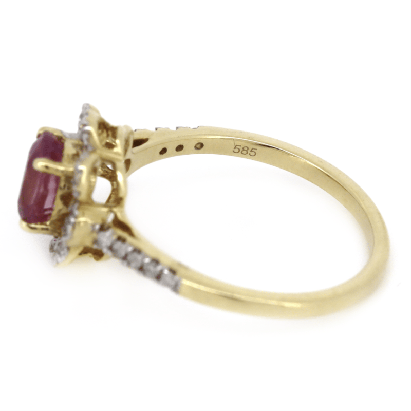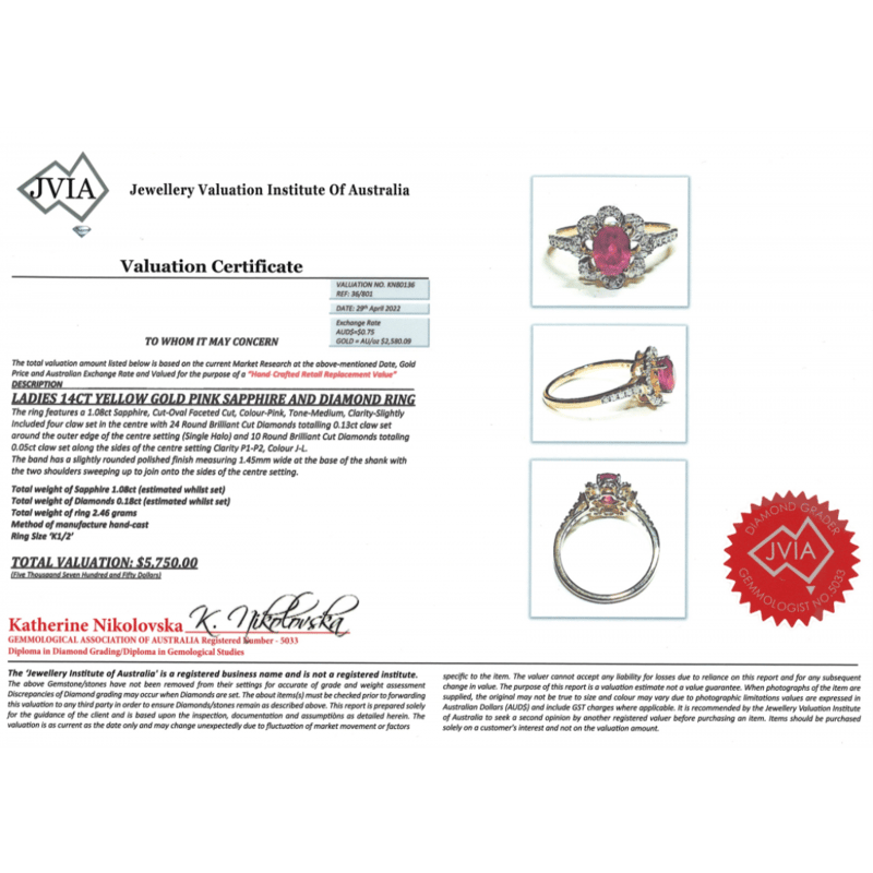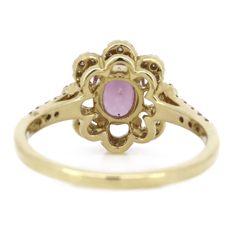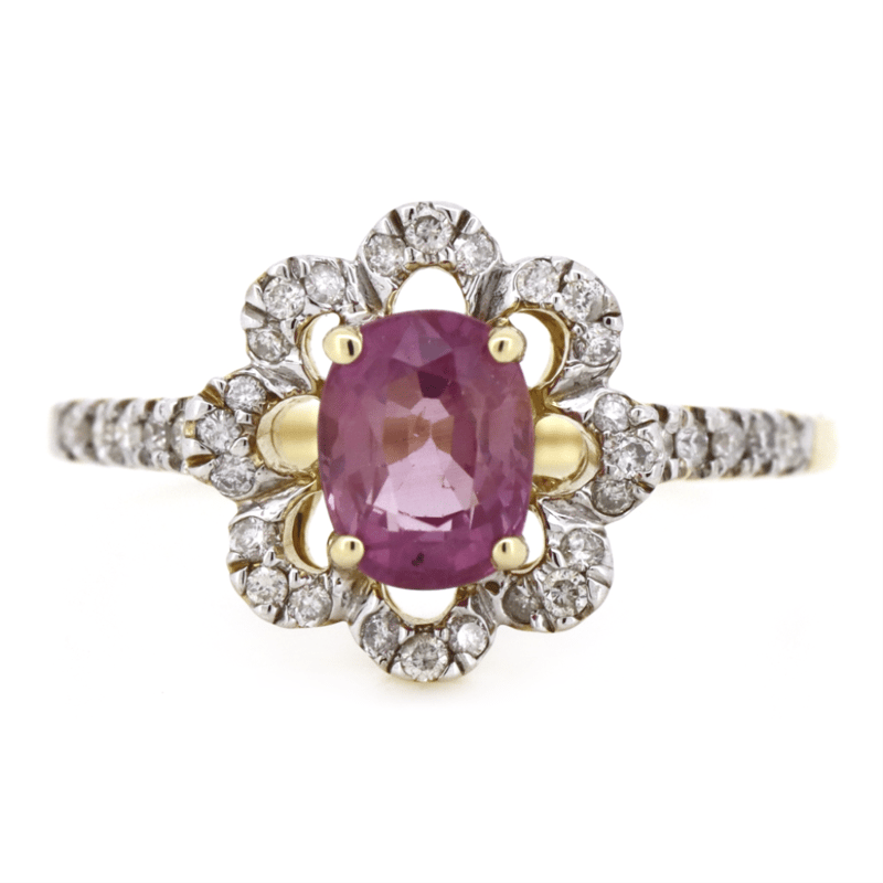 14K YELLOW GOLD, PINK SAPPHIRE AND DIAMOND, FLORAL RING. THE CENTRE FEATURES, ONE OVAL CUT, MEDIUM PINK, SAPPHIRE (1.08CT, SLIGHTLY INCLUDED), CLAW SET. SURROUNDING THE CENTRE IN A DECORATIVE FLORAL BORDER AND ALONG THE BAND ARE, 34 ROUND BRILLIANT CUT, DIAMONDS (0.18CT TDW, J-L COLOUR, P1-P2 CLARITY), CLAW SET. RING SIZE K 1/2.