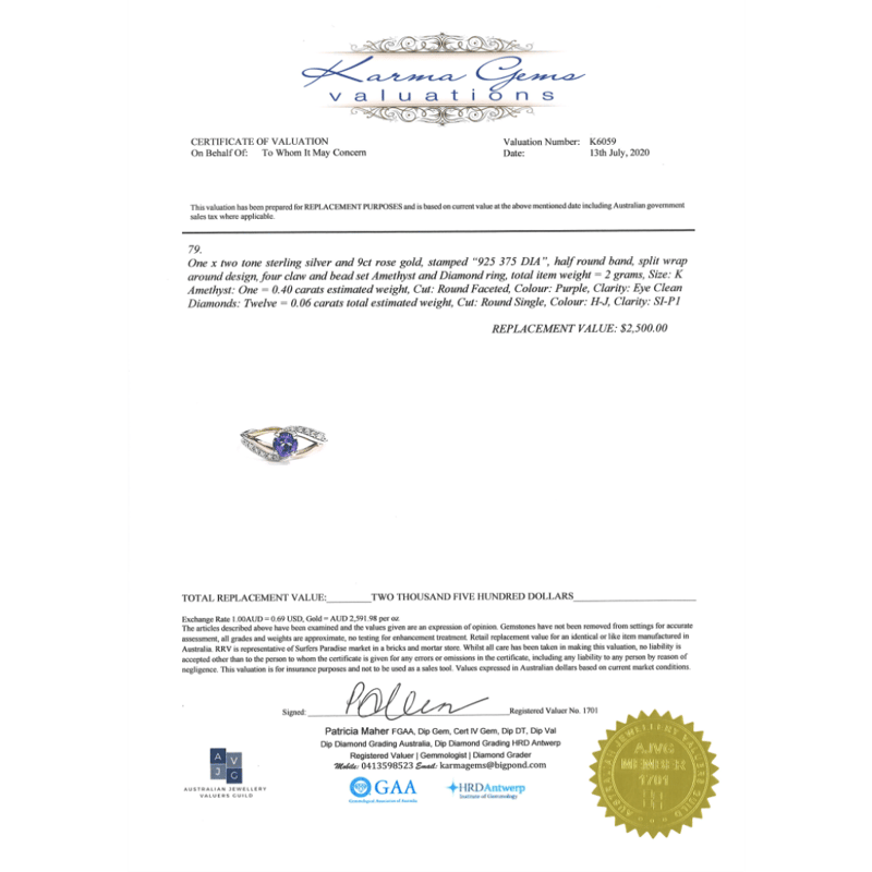 This Insurance Valuation has been provided by a registered Jewellery Valuer and is intended for insurance purposes only. The valuation amount has no bearing on the auction value of the item. Any questions regarding the valuation should be directed to the issuing Valuer (refer to contact details on the certificate) as Lloyds have no association or relationship with the Valuer or the valuation amount contained within the valuation.