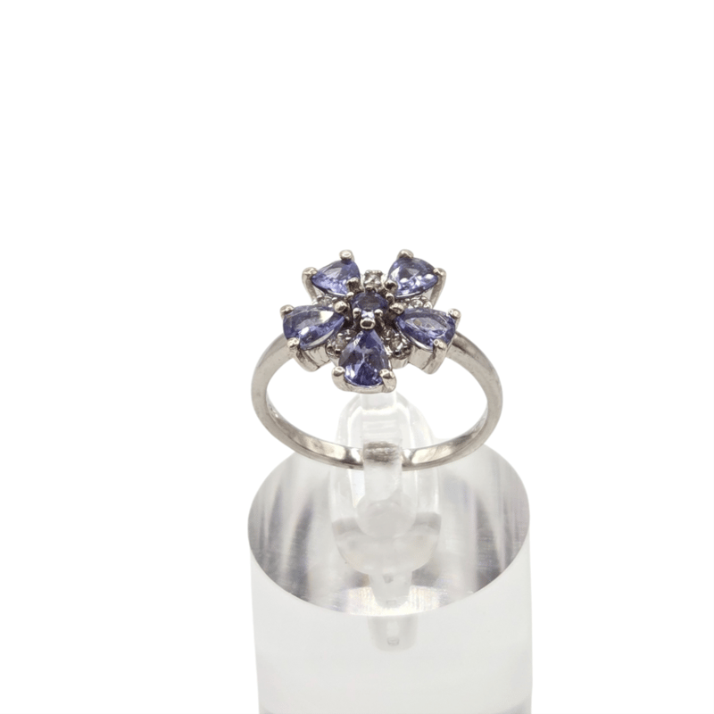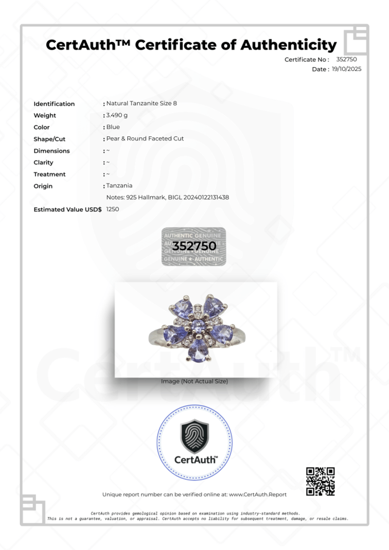 Certified Natural Tanzanite Ring Featuring Multiple Pear And Round Faceted Stones Arranged In A Floral Cluster Setting. Crafted In Solid 925 Sterling Silver (Hallmarked), This Piece Showcases The Signature Violet-Blue Tones Of Tanzanian Tanzanite. Certauth™ Certificate No. 352750, Bigl 20240122131438.