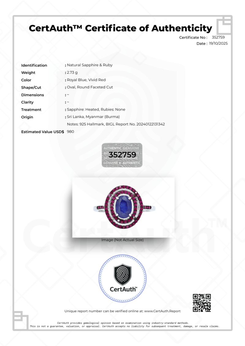 Certified Natural Sapphire And Ruby Ring Set In Solid 925 Sterling Silver. The Centrepiece Features A Royal Blue Oval Sapphire From Sri Lanka, Surrounded By Vivid Red Burmese Rubies In A Double Halo Arrangement. Sapphire Is Heat-Treated; Rubies Are Natural And Untreated. Certauth™ Certificate No. 352759, Bigl Report 20240122131342.