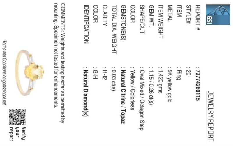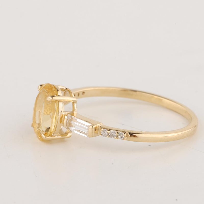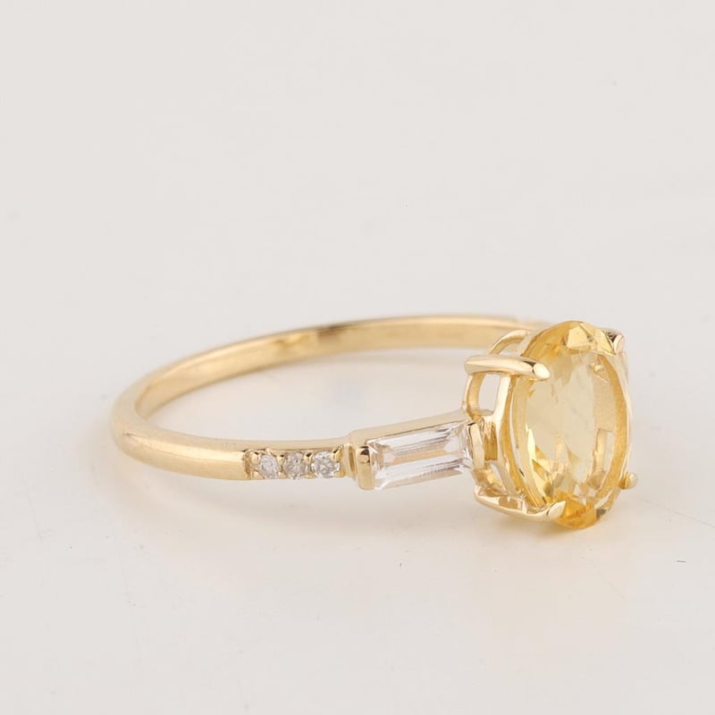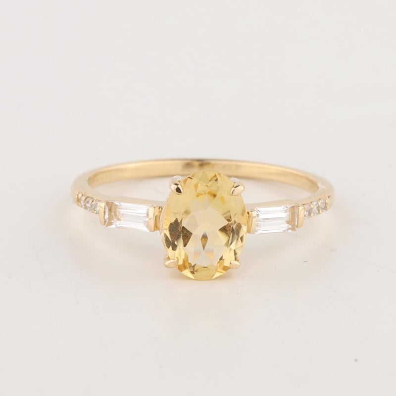 The Ring Consists Of (1) Oval Brilliant Natural Citrine & (2) Baguette Brilliant Cut White Topaz. Surrounding The Main Stones Are Round Brilliant Cut Natural Diamonds.