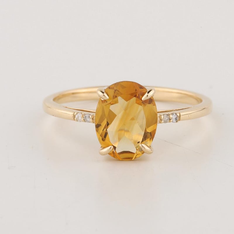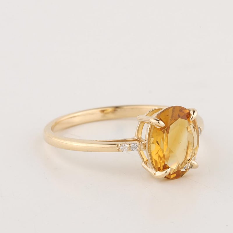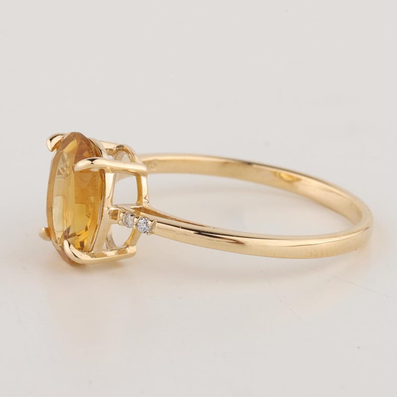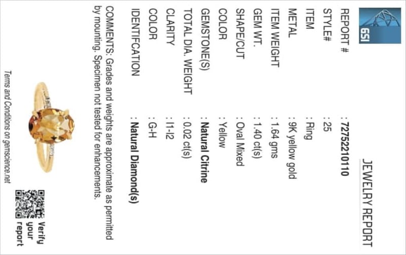 9CT YELLOW GOLD NATURAL CITRINE & DIAMOND RING Weight Of The Item: 1.64 GFineness Of Metal(S): Yellow Gold 9KtThe Ring Consists Of (1) Oval Brilliant Natural Citrine. Surrounding The Main Stones Are Round Brilliant Cut Natural Diamonds.Antique StyleIdentification: Natural CitrineColor: YellowShape: Oval Brilliant CutNo. Of Stone: 1Dimension: 9 Mm X 7 Mm X 5.4 MmWeight: 1.4 Carats Identification: Natural DiamondShape: Round Brilliant CutWeight: 0.02 CtsCut: Excellent 0160640+24