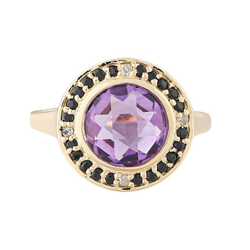 The Ring Consists Of (1) Round Faceted Natural Amethyst & (23) Round Brilliant Cut Black Spinel. Surrounding The Main Stones Are Natural Diamonds.