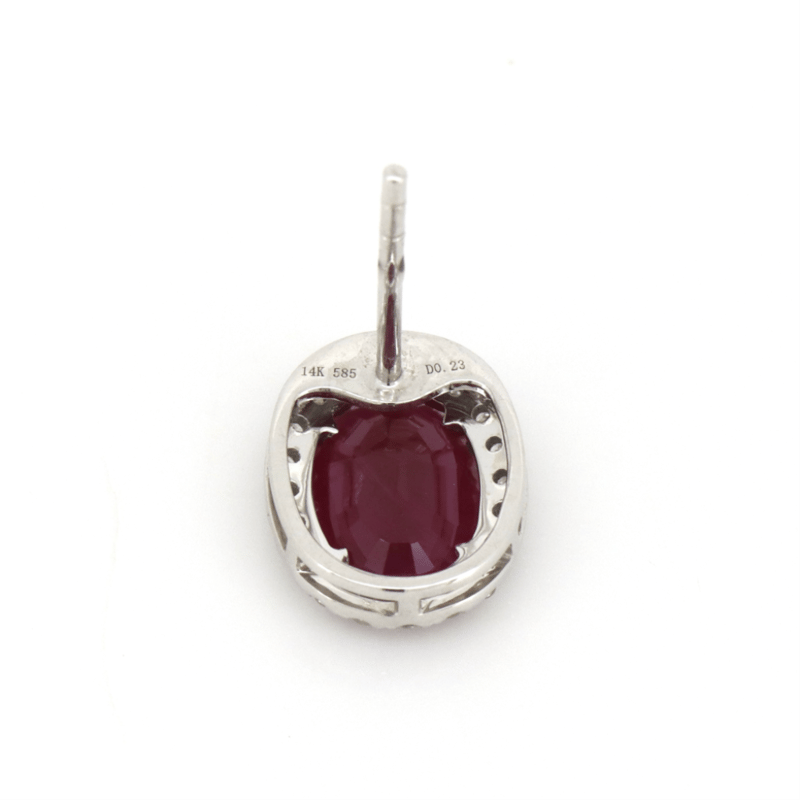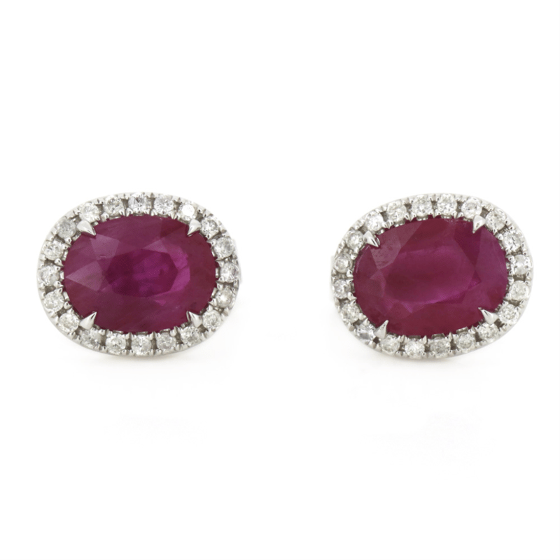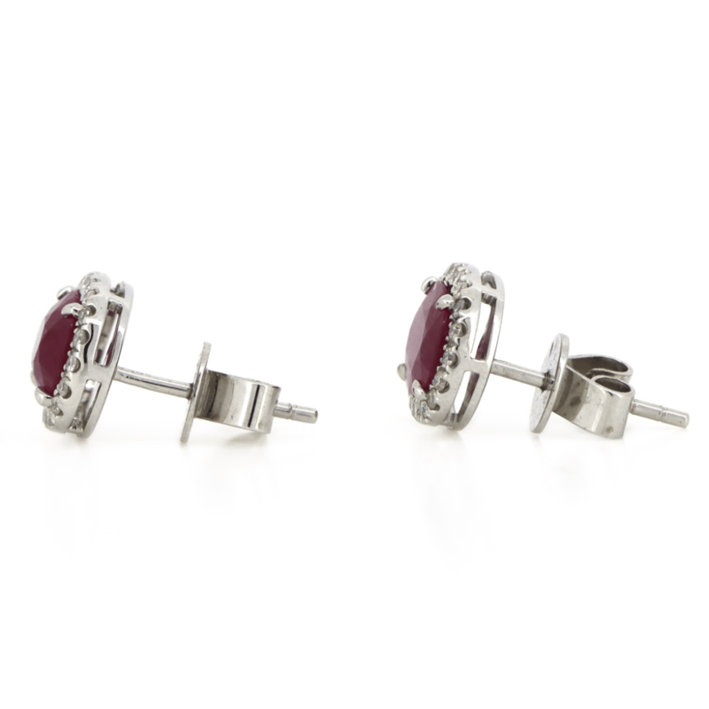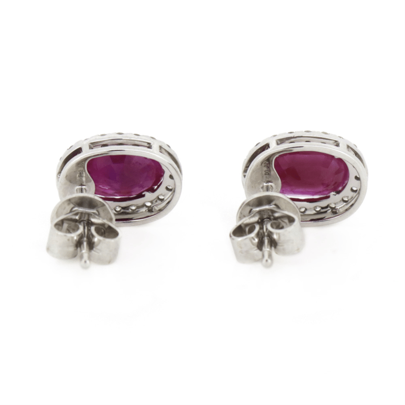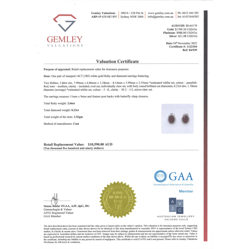 14K WHITE GOLD, RUBY AND DIAMOND, HALO STUD EARRINGS The Centres Feature, 2 Oval Cut, Medium Purplish-Red, Rubies (2.66Ct Tsw, Included), 4 Claw Set. Surrounding The Centres In Halos Are, 40 Round Brilliant Cut, Diamonds (0.23Ct Tdw, J-K Colour, Si2-I2 Clarity), Micro-Claw Set. The Earrings Have Post Backs, With 14K White Gold Butterfly Clasps. Jewellery Valuations Provided By A Third Party Professional Not Directly Associated With Lloyds Auctions at AUD $10,590.00This Insurance Valuation has been provided by a registered Jewellery Valuer and is intended for insurance purposes only. The valuation amount has no bearing on the auction value of the item. Any questions regarding the valuation should be directed to the issuing Valuer (refer to contact details on the certificate) as Lloyds have no association or relationship with the Valuer or the valuation amount contained within the valuation. Condition: GOOD 0645897+1334