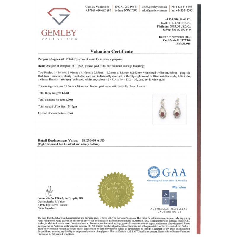 This Insurance Valuation has been provided by a registered Jewellery Valuer and is intended for insurance purposes only. The valuation amount has no bearing on the auction value of the item. Any questions regarding the valuation should be directed to the issuing Valuer (refer to contact details on the certificate) as Lloyds have no association or relationship with the Valuer or the valuation amount contained within the valuation.