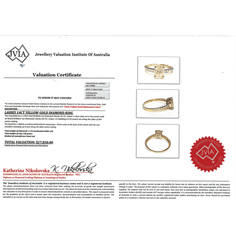 This Insurance Valuation has been provided by a registered Jewellery Valuer and is intended for insurance purposes only. The valuation amount has no bearing on the auction value of the item. Any questions regarding the valuation should be directed to the issuing Valuer (refer to contact details on the certificate) as Lloyds have no association or relationship with the Valuer or the valuation amount contained within the valuation.