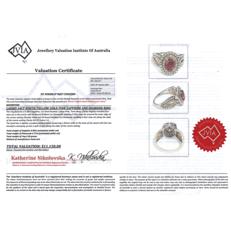 The Centre Features, One Oval Faceted Cut, Deep Pink, Sapphire (0.99Ct, Slightly Included), 4 Claw Set. Surrounding The Centre In A Double Halo And Decorating The Split Band Are, 101 Round Brilliant Cut, Diamonds (0.77Ct Tdw, I-K Colour, Si2-P2 Clarity), Claw Set. Ring Size M 1/2.
