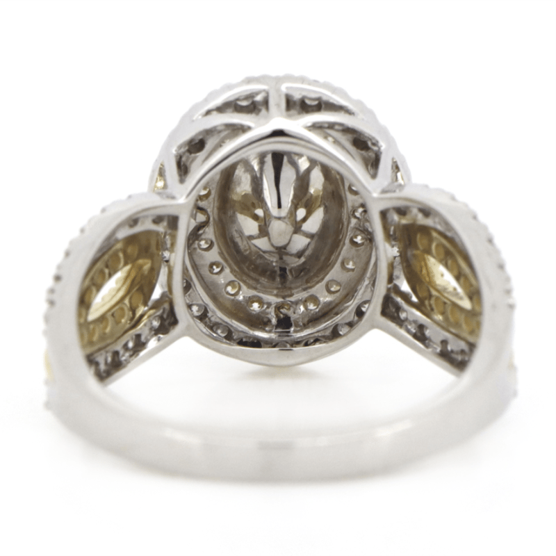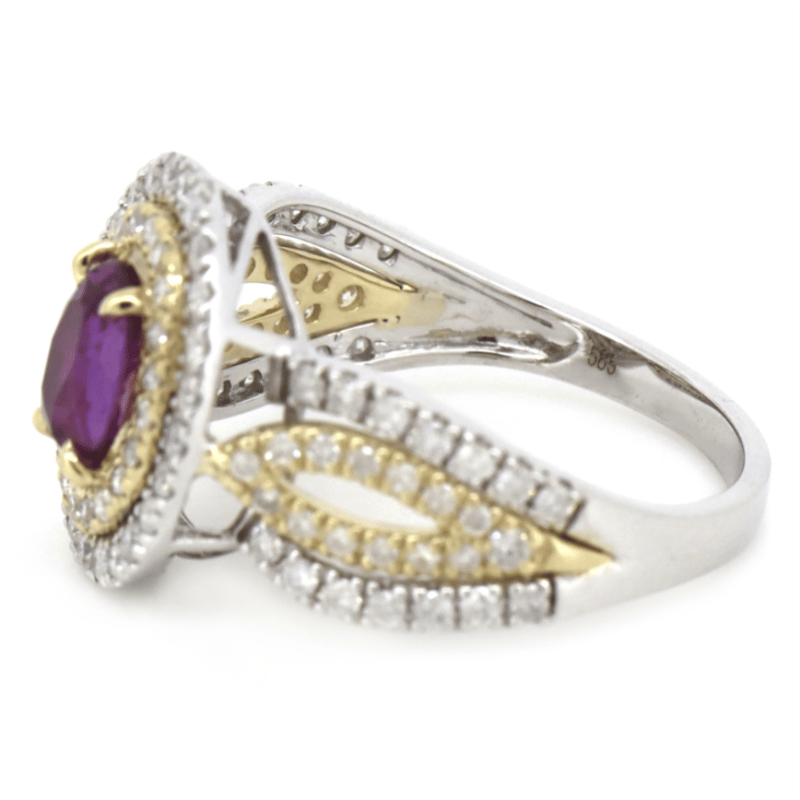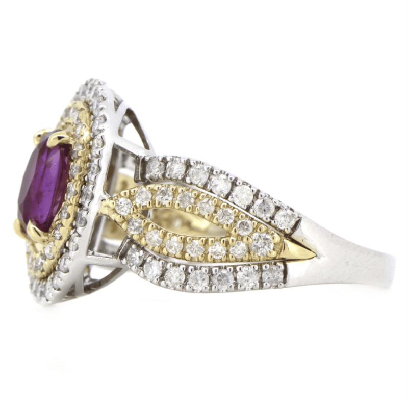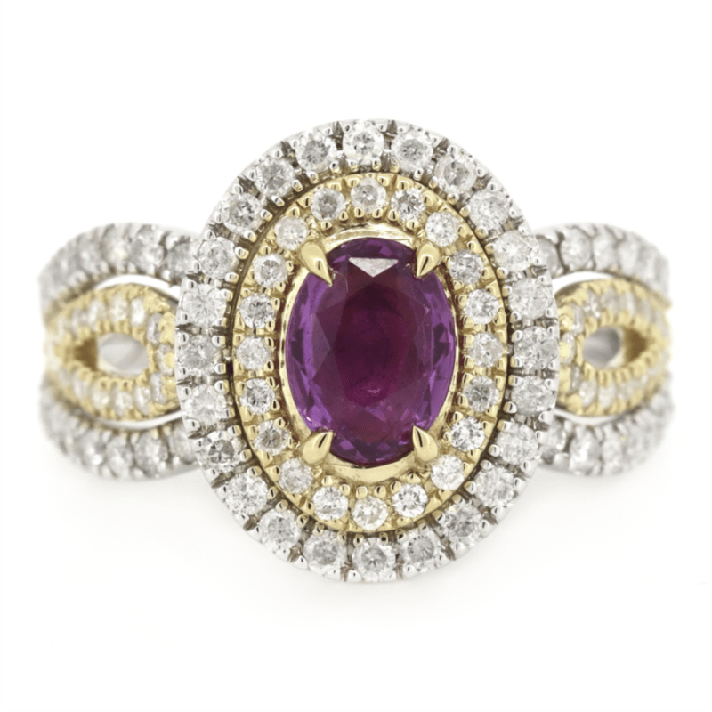 14K WHITE/YELLOW GOLD, PINK SAPPHIRE AND DIAMOND, DOUBLE HALO SPLIT BAND RING