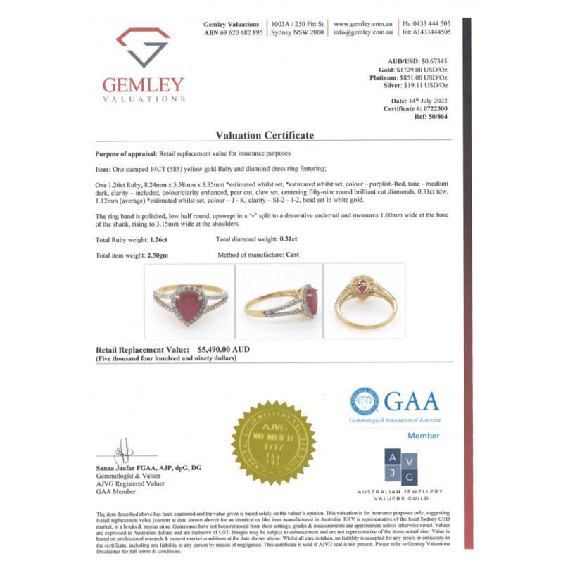 This Insurance Valuation has been provided by a registered Jewellery Valuer and is intended for insurance purposes only. The valuation amount has no bearing on the auction value of the item. Any questions regarding the valuation should be directed to the issuing Valuer (refer to contact details on the certificate) as Lloyds have no association or relationship with the Valuer or the valuation amount contained within the valuation.