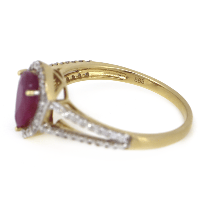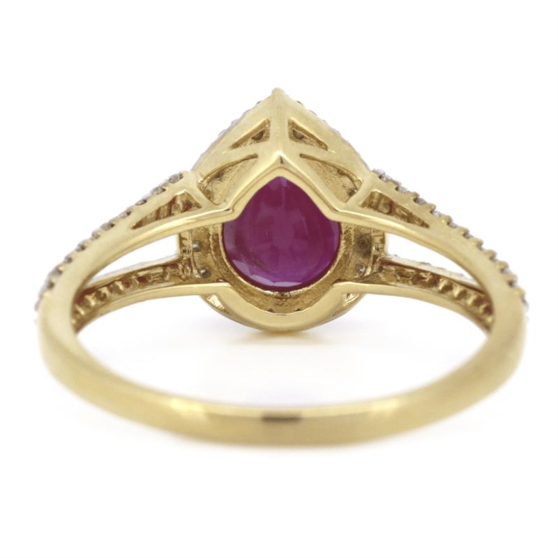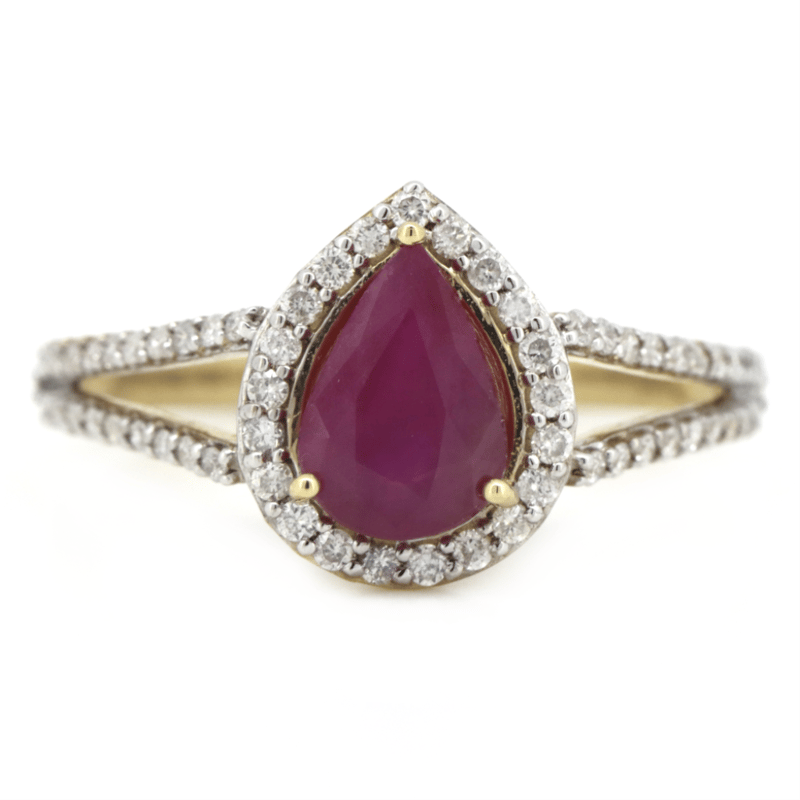 The Centre Features, One Pear Cut, Medium-Dark Purplish-Red, Ruby (1.26Ct, Included, Enhanced), Claw Set. Surrounding The Centre In A Halo And Decorating The Split Band Are, 59 Round Brilliant Cut, Diamonds (0.31Ct Tdw, J-K Colour, Si2-I2 Clarity), Bead Set In White Gold. Ring Size N.