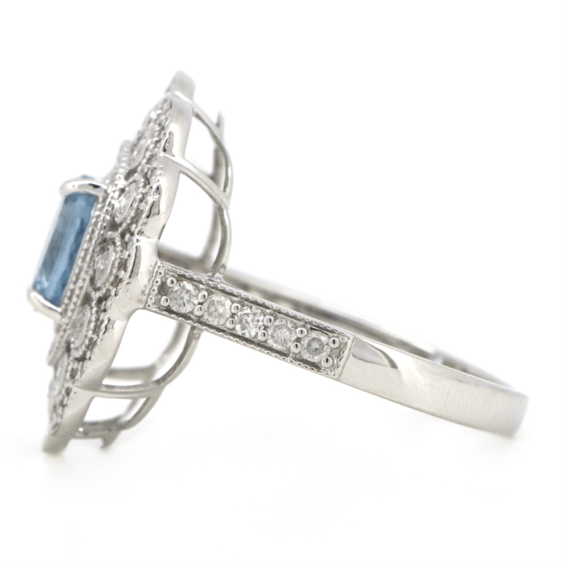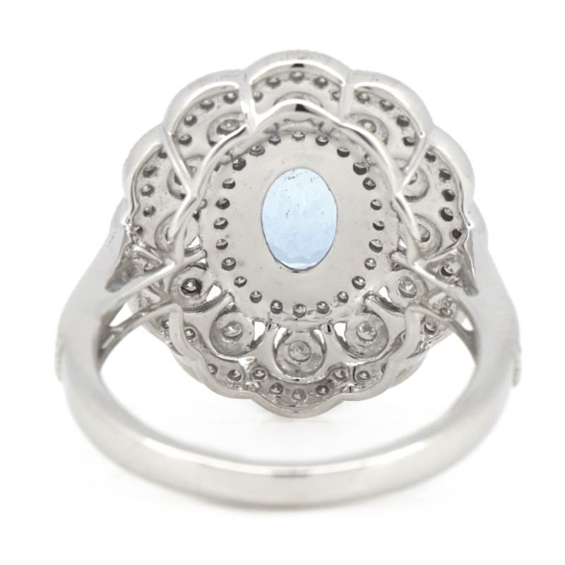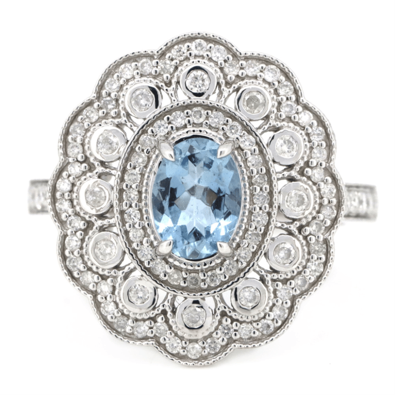 The Centre Features, One Oval Cut, Moderate Blue, Aquamarine (0.67Ct, Slightly Included), 4 Claw Set. Encompassing The Design Are, 98 Round Brilliant Cut, Diamonds (0.56Ct Tdw, G-H Colour, Si1-Si2 Clarity), Bezel/Bead Set In White Gold. Ring Size O.