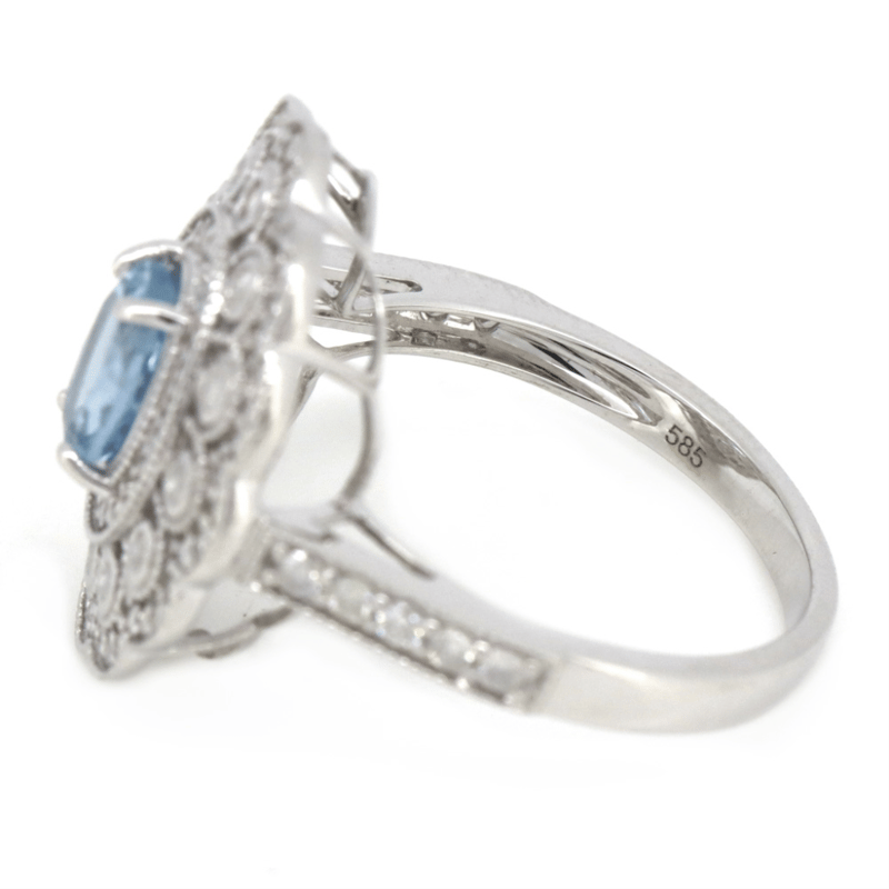 14K WHITE GOLD, AQUAMARINE AND DIAMOND, CLUSTER RING