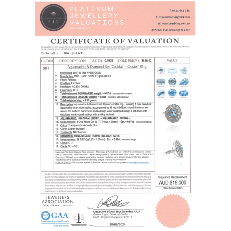 This Insurance Valuation has been provided by a registered Jewellery Valuer and is intended for insurance purposes only. The valuation amount has no bearing on the auction value of the item. Any questions regarding the valuation should be directed to the issuing Valuer (refer to contact details on the certificate) as Lloyds have no association or relationship with the Valuer or the valuation amount contained within the valuation.