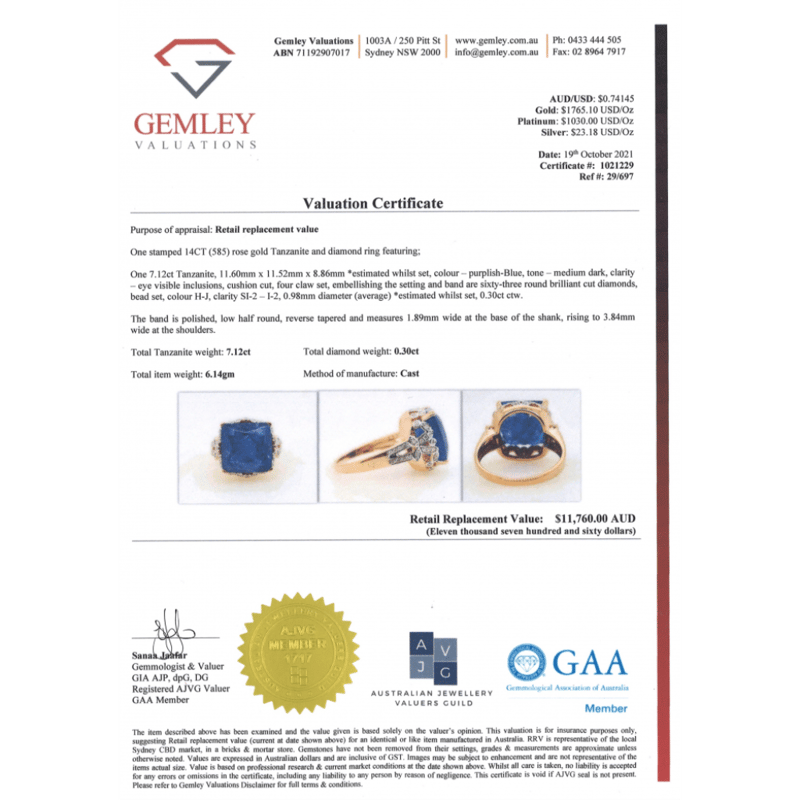 This Insurance Valuation has been provided by a registered Jewellery Valuer and is intended for insurance purposes only. The valuation amount has no bearing on the auction value of the item. Any questions regarding the valuation should be directed to the issuing Valuer (refer to contact details on the certificate) as Lloyds have no association or relationship with the Valuer or the valuation amount contained within the valuation.