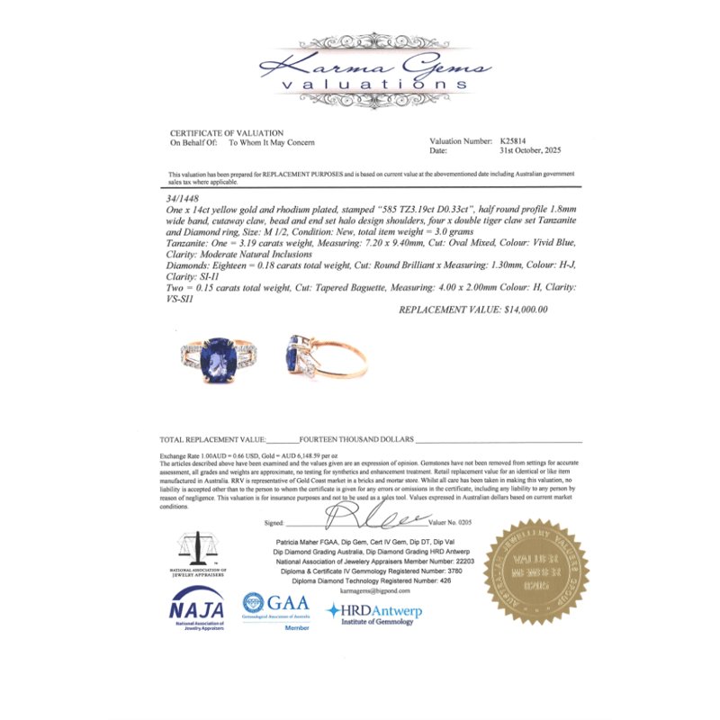 This Insurance Valuation has been provided by a registered Jewellery Valuer and is intended for insurance purposes only. The valuation amount has no bearing on the auction value of the item. Any questions regarding the valuation should be directed to the issuing Valuer (refer to contact details on the certificate) as Lloyds have no association or relationship with the Valuer or the valuation amount contained within the valuation.