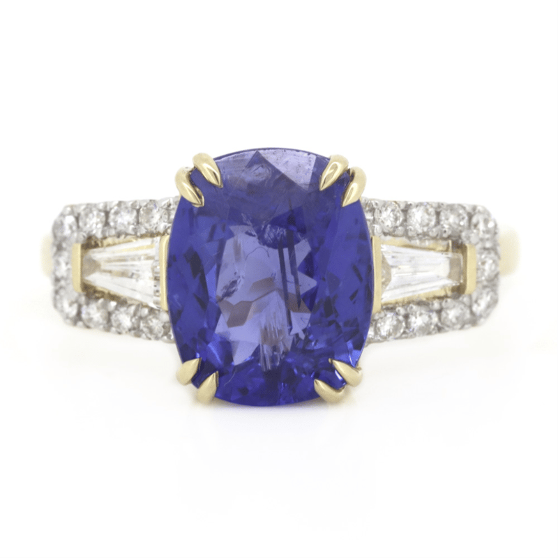 The Centre Features, One Oval Cut, Vivid Blue, Tanzanite (3.19Ct, Moderate Inclusions), Double Claw Set. Flanking The Centre Are, 18 Round Brilliant And 2 Tapered Baguette Cut, Diamonds (0.33Ct Tdw, H-J Colour, Vs-I1 Clarity) Bead/Bar Set. Ring Size M 1/2.