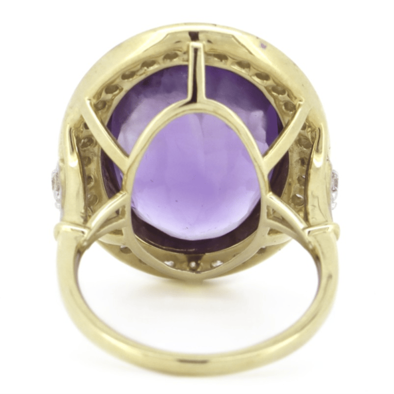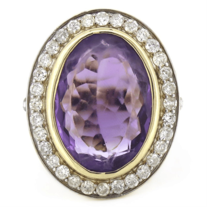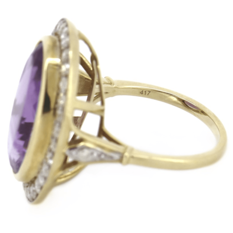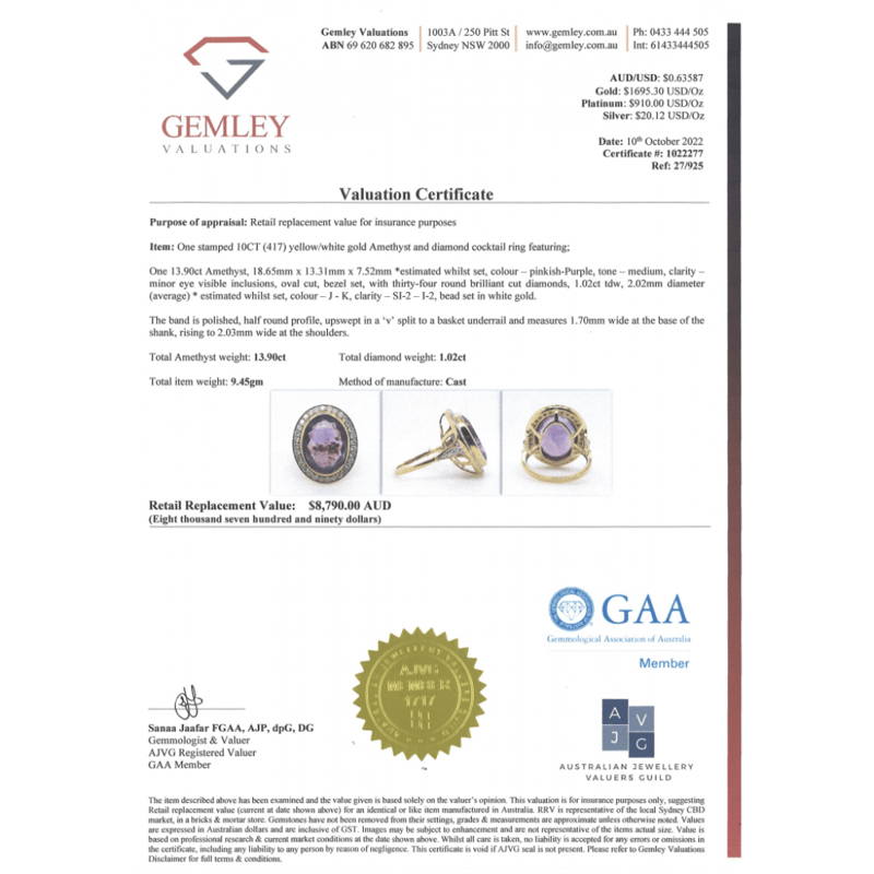 10K YELLOW/WHITE GOLD, 13.90CT AMETHYST AND DIAMOND, COCKTAIL RING The Centre Features, One Oval Cut, Medium Pinkish-Purple, Amethyst (13.90Ct, Minor Eye Visible Inclusions), Bezel Set. Surrounding The Centre In Halo And Decorating The Shoulders Are, 34 Round Brilliant Cut, Diamonds (1.02Ct Tdw, J-K Colour, Si2-I2 Clarity), Bead Set In White Gold. Ring Size P. New. Jewellery Valuations Provided By A Third Party Professional Not Directly Associated With Lloyds Auctions at AUD $8,790.00This Insurance Valuation has been provided by a registered Jewellery Valuer and is intended for insurance purposes only. The valuation amount has no bearing on the auction value of the item. Any questions regarding the valuation should be directed to the issuing Valuer (refer to contact details on the certificate) as Lloyds have no association or relationship with the Valuer or the valuation amount contained within the valuation. Condition: GOOD 0645897+1343