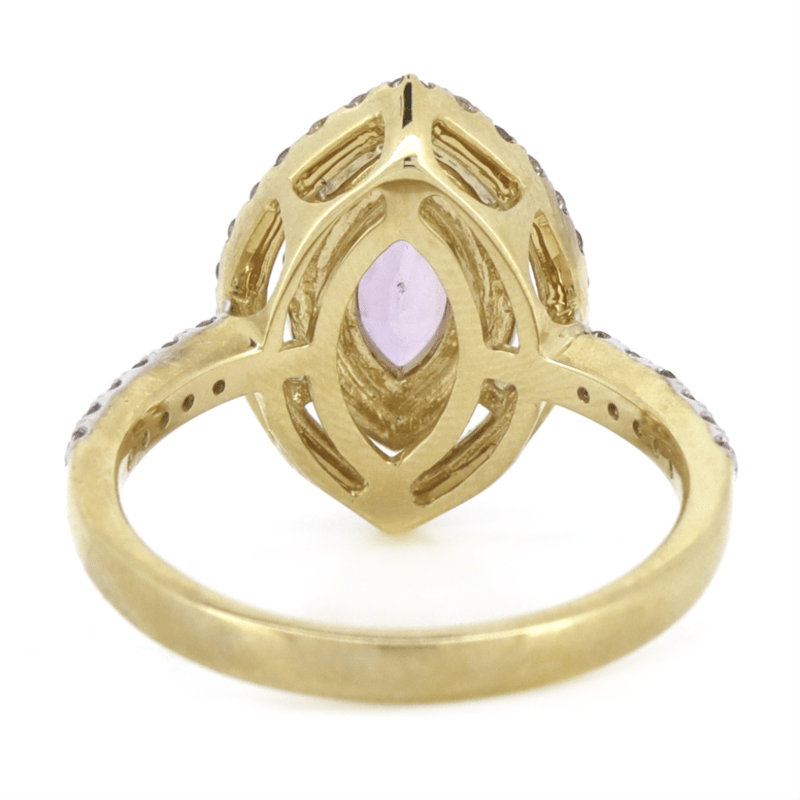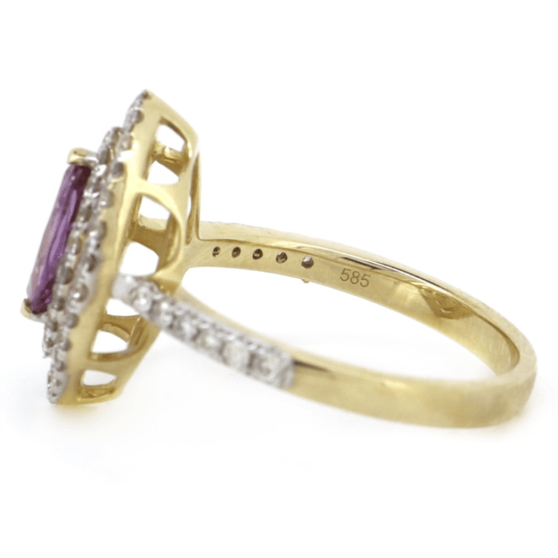 14K YELLOW GOLD, PINK SAPPHIRE AND DIAMOND, DOUBLE HALO RING