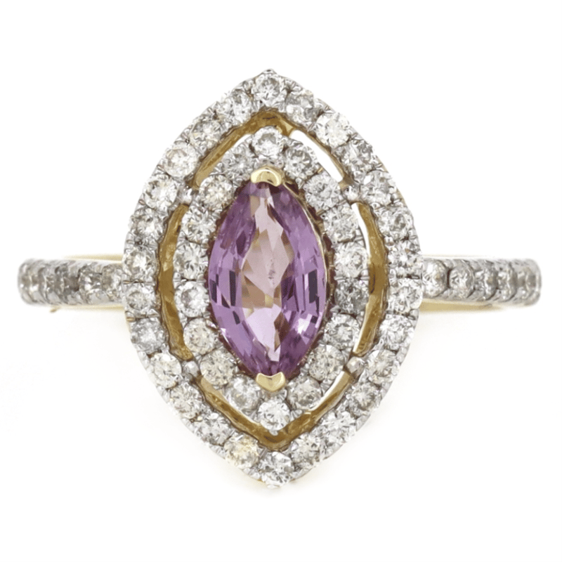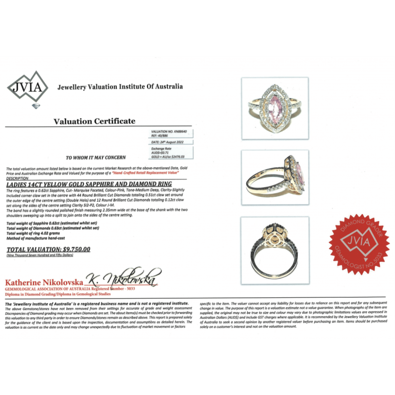 The Centre Features, One Marquise Faceted Cut, Medium-Deep Pink, Sapphire (0.62Ct, Slightly Included), Claw Set. Surrounding The Centre In A Double Halo And Decorating The Band Are, 56 Round Brilliant Cut, Diamonds (0.63Ct Tdw, J-M Colour, Si2-P2 Clarity), Claw Set. Ring Size M 1/2.
