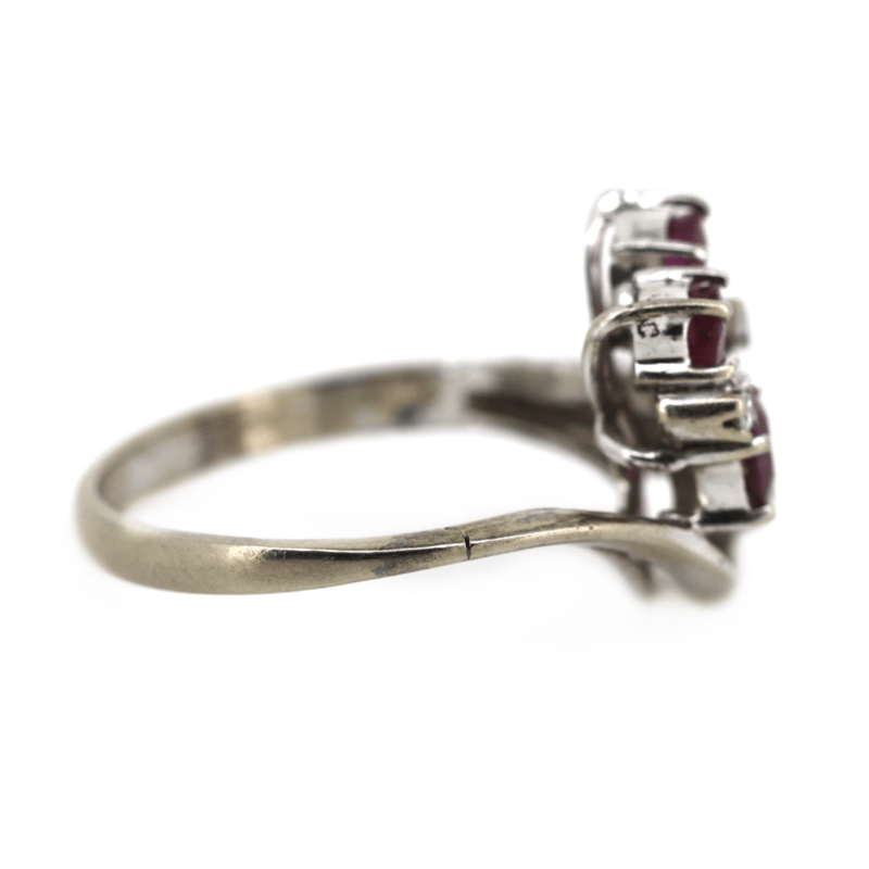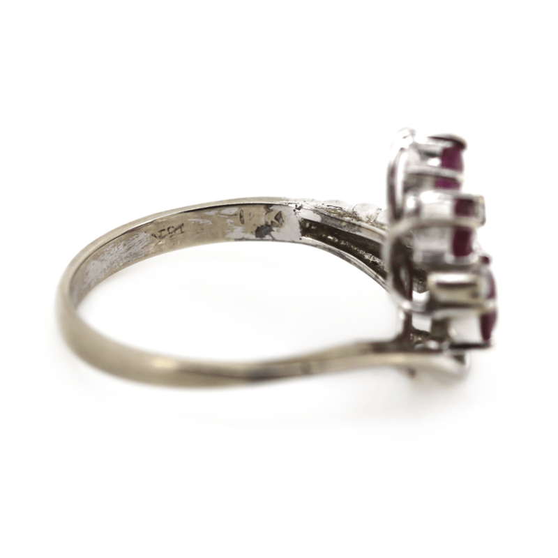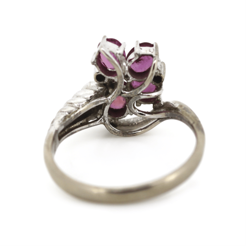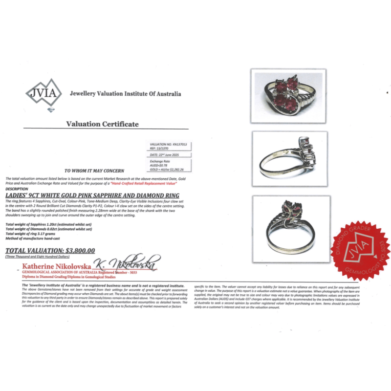 9K WHITE GOLD, PINK SAPPHIRES AND DIAMOND, DRESS RING The Centre Features, 4 Oval Cut, Medium-Deep Pink, Sapphires (1.20Ct Tsw, Eye Visible Inclusions), 4 Claw Set. Encompassing The Centre Are, 2 Round Brilliant Cut, Diamonds (0.02Ct Tdw, I-K Colour, P1-P2 Clarity), Claw Set. Ring Size O. Pre-Owned.Small Crack In Band As Seen In Photos. Jewellery Valuations Provided By A Third Party Professional Not Directly Associated With Lloyds Auctions at AUD $3,800.00This Insurance Valuation has been provided by a registered Jewellery Valuer and is intended for insurance purposes only. The valuation amount has no bearing on the auction value of the item. Any questions regarding the valuation should be directed to the issuing Valuer (refer to contact details on the certificate) as Lloyds have no association or relationship with the Valuer or the valuation amount contained within the valuation. Condition: GOOD 0645897+1310