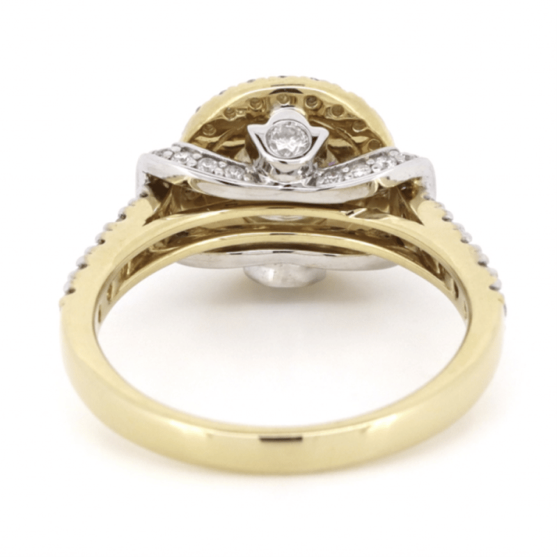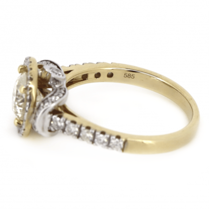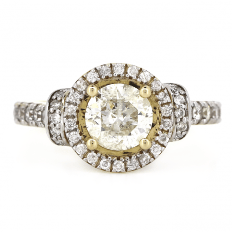 The Centre Features, One Round Brilliant Cut, Diamond (0.85Ct, M Colour, P2 Clarity), 4 Claw Set. Surrounding The Centre In A Halo, Decorating The Setting And Along The Band Are, 56 Round Brilliant Cut, Diamonds (0.67Ct Tdw, J-K Colour, P2+ Clarity), Claw/Bead Set. Ring Size M.