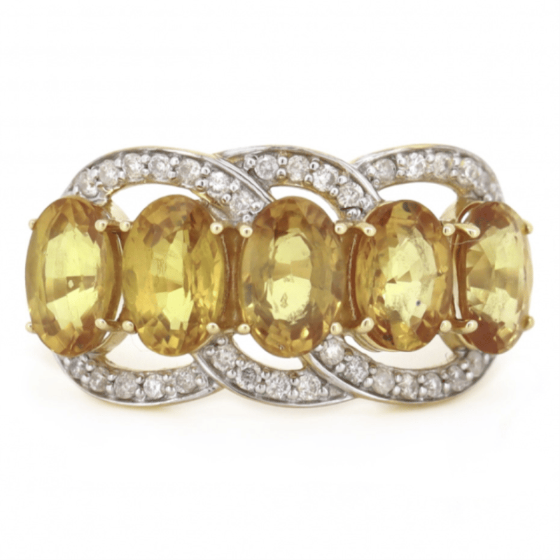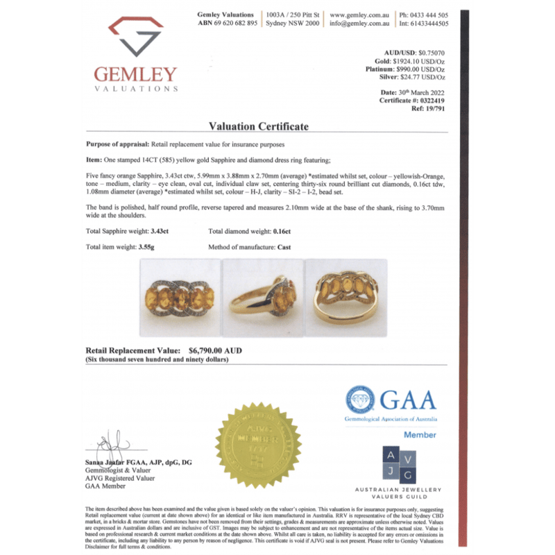 14K YELLOW GOLD, ORANGE SAPPHIRE AND DIAMOND, ETERNITY RING The Design Centrally Features, 5 Oval Cut, Yellowish-Orange, Sapphires (3.43Ct Tsw, Eye Clean Clarity), 4 Claw Set. Decorating The Setting Are, 36 Round Brilliant Cut, Diamonds (0.16Ct Tdw, H-J Colour, Si2-I2 Clarity), Bead Set. Ring Size M 1/2. Jewellery Valuations Provided By A Third Party Professional Not Directly Associated With Lloyds Auctions at AUD $6,790.00This Insurance Valuation has been provided by a registered Jewellery Valuer and is intended for insurance purposes only. The valuation amount has no bearing on the auction value of the item. Any questions regarding the valuation should be directed to the issuing Valuer (refer to contact details on the certificate) as Lloyds have no association or relationship with the Valuer or the valuation amount contained within the valuation. Condition: GOOD 0645897+1398