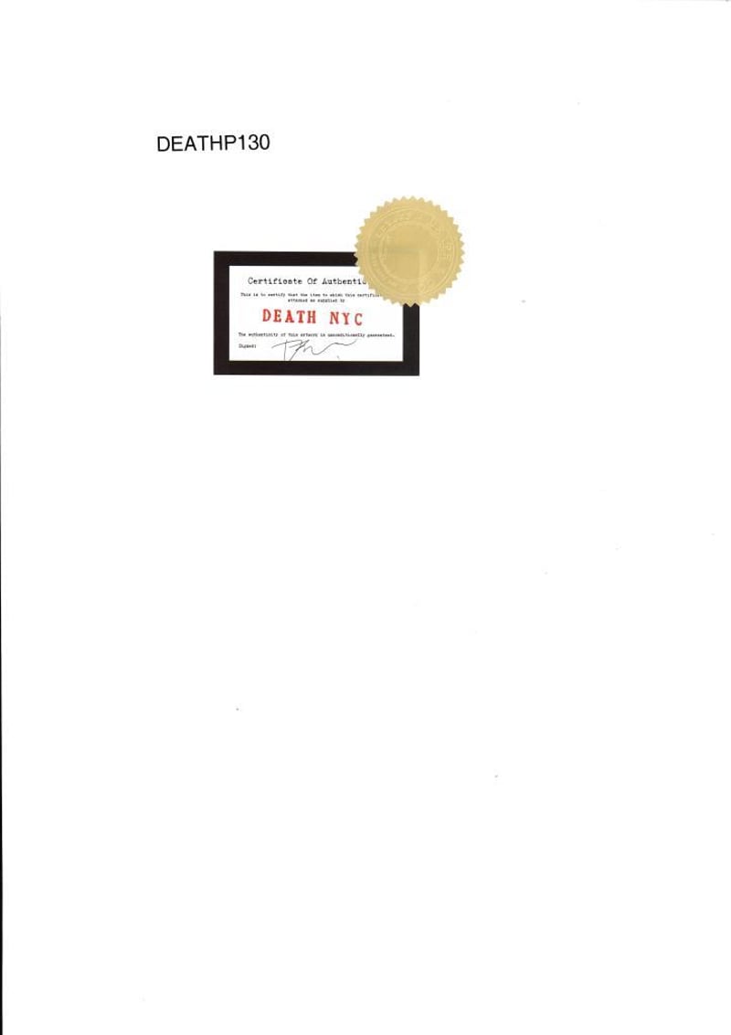 DEATH NYC (1979 - )Limited Edition Lithograph On Paper Title: Deathp130Image Size: 30cm x 42cmFrame Size: Artwork Is UnframedSignature Details: Edition: 81/100 Signed On Lower Left Embossed Condition: Good Signed On Lower Left Embossed Lower Left, Editioned Lower Right, Embossed Gold Seal On Verso Accompanied By A Certificate Of Authenticity Condition: Excellent Provenance: Death Nyc Is A Street Artist From New York. She Grew Up In New York, She Was Exposed To A Variety Of Cultures, Which Made Her Question The Things She Saw On The Street. This Experience Is Vital In The Choice Of Her Pseudonym And Approach. Artwork Is Unframed & Accompanied By A Certificate Of Authenticity 162990+8