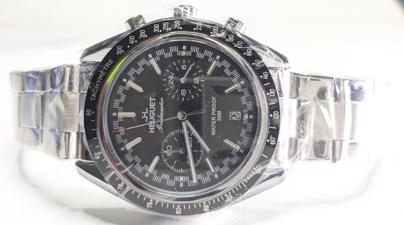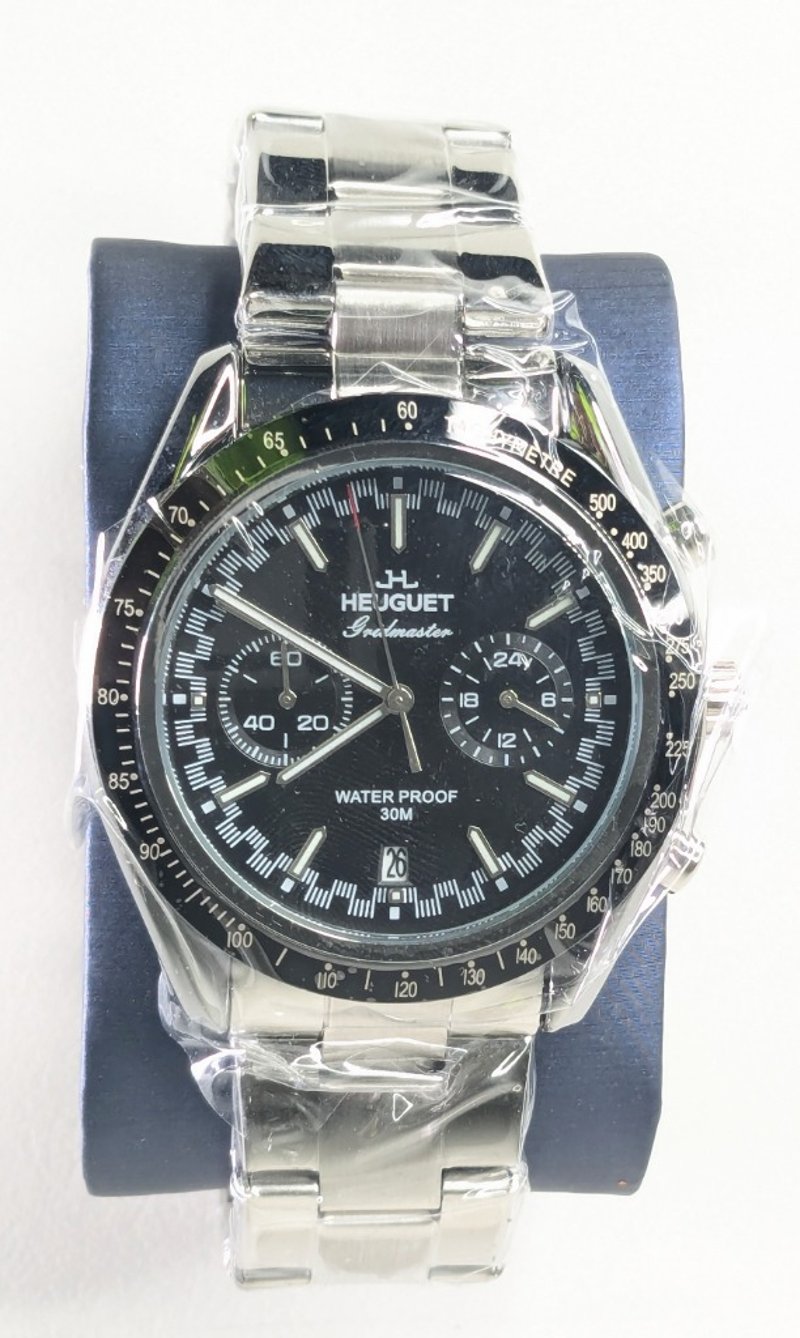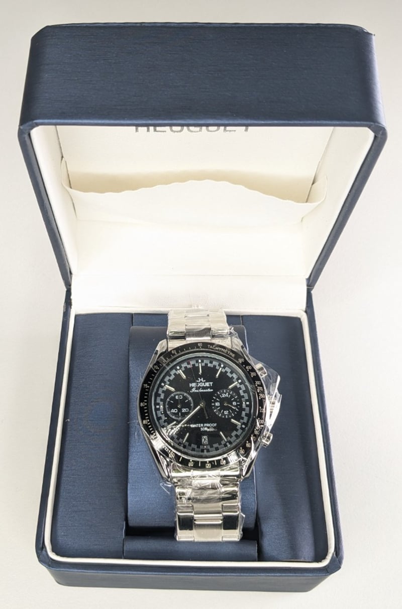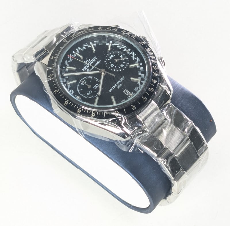 HEUGUET HEU601 DIAL: 5 CASE DESCRIPTION: STAINLESS STEEL CASE SIZE: 44MM BRACELET: 20MM STAINLESS STEEL BRACELET CLASP MOVEMENT: QUARTZ BOX: INCLUDED PAPERS: INCLUDED Condition: Good - Refer To Images FC 163001+1
