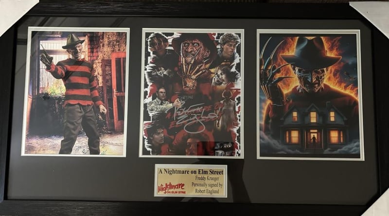 Freddie Kruger Nightmare On Elm St Personally Signed And Framed Movie Piece. Measuring 650 X 480, This Is Ready To Hang. The Item Is Accompanied By A Certificate Of Authenticity.