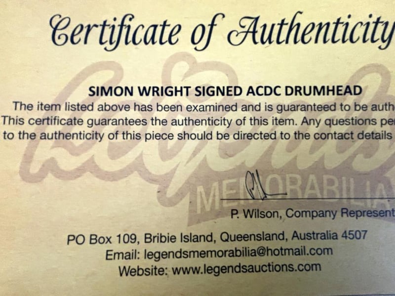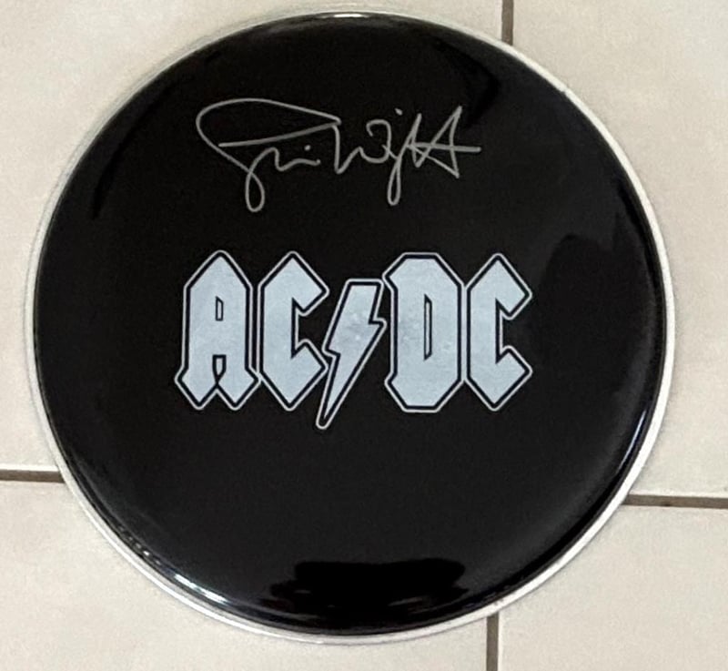 A 12 Inch Acdc Drumskin Personally Signed By Former Drummer Simon Wright. The Item Is Accompanied By A Certificate Of Authenticity.