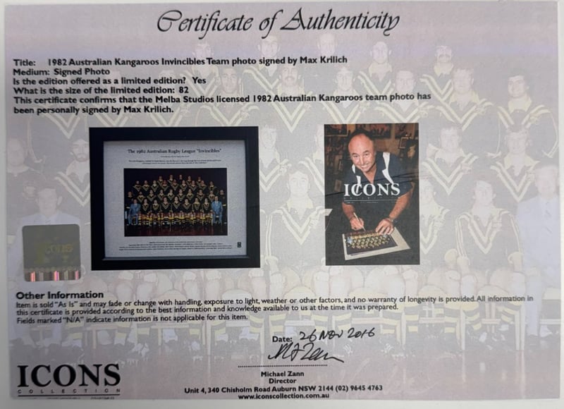 THE 1982 AUSTRALIAN RUGNY LEAGUE 'INVINCIBLES' SIGNED BY MAC KRILICH