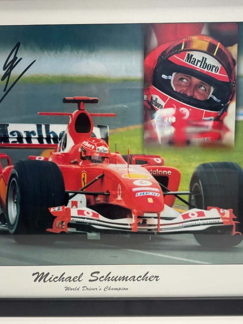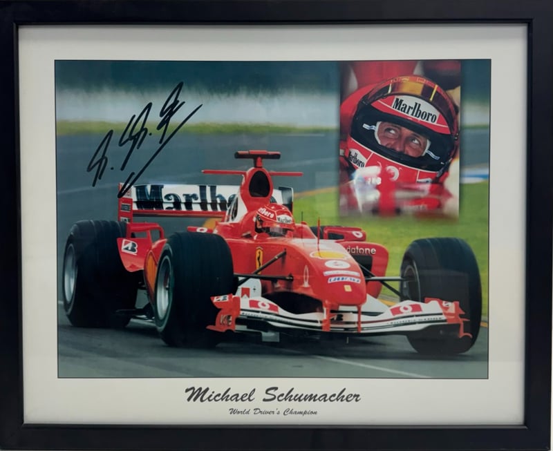 MICHAEL SCHUMACHER SIGNED WORLD DRIVER'S CHAMPION SIGNED AND FRAMED IMAGE