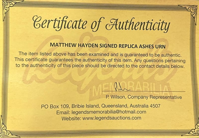 Matthew Hayden Personally Signed Replica Ashes Urn. Matthew Hayden Is An Australian Cricket Commentator And Former Cricketer. Hayden'S Playing Career Spanned Fifteen Years. The Item Is Accompanied By A Certificate Of Authenticity.