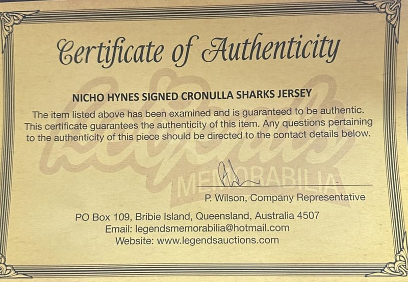 Cronulla Sharks Jersey Personally Signed By Nicho Hynes. Nicholas Hynes Is An Australian Professional Rugby League Footballer Who Plays As A Halfback For The Cronulla-Sutherland Sharks In The Nrl. The Item Is Accompanied By A Certificate Of Authenticity.