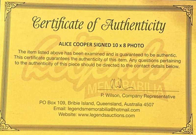 Alice Cooper Personally Signed 10 X 8 Photo. Alice Cooper Is An American Singer And Songwriter. With A Career Spanning Over Five Decades, Cooper Is Renowned For His Distinctive Raspy Singing Voice And Theatrical Stage Shows, Which Feature Numerous Props And Illusions. The Item Is Accompanied By A Certificate Of Authenticity.