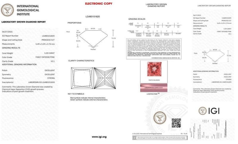 1.00 CARAT PRINCRSS CUT DIAMOND FANCY 1.00 Carat Princrss Cut Diamond Fancy Intense Pink /Vs1 Igi Certificate # Lg 480151820 Laser Inscribed : Labgrown Igi Lg 480151820 Polish : Excellent Symmetry : Excellent Flourescence : Strong Type : Cvd Condition: Good - Refer Images 0488974+13