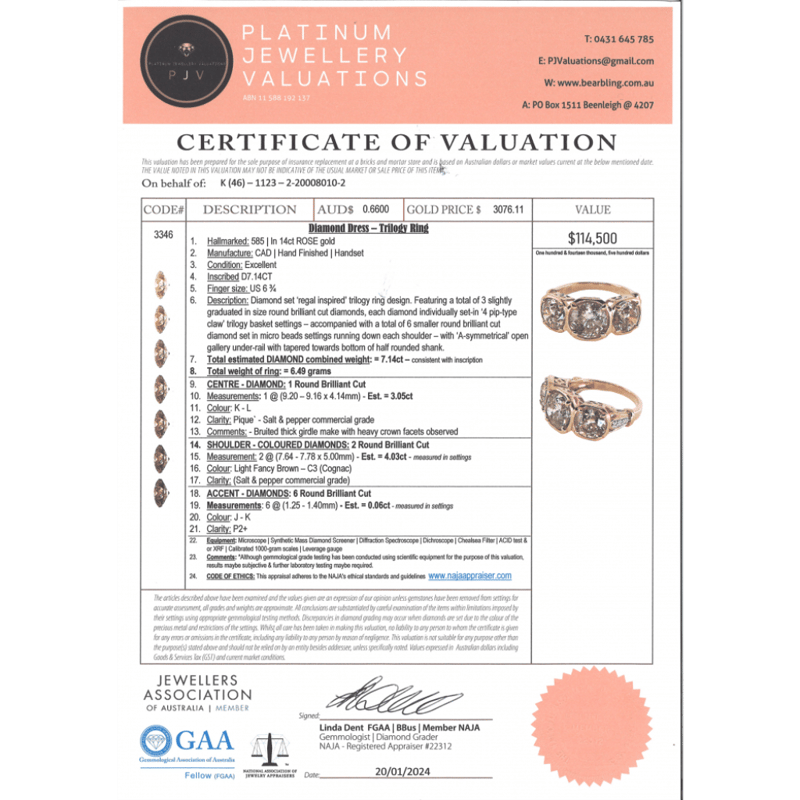 This Insurance Valuation has been provided by a registered Jewellery Valuer and is intended for insurance purposes only. The valuation amount has no bearing on the auction value of the item. Any questions regarding the valuation should be directed to the issuing Valuer (refer to contact details on the certificate) as Lloyds have no association or relationship with the Valuer or the valuation amount contained within the valuation.