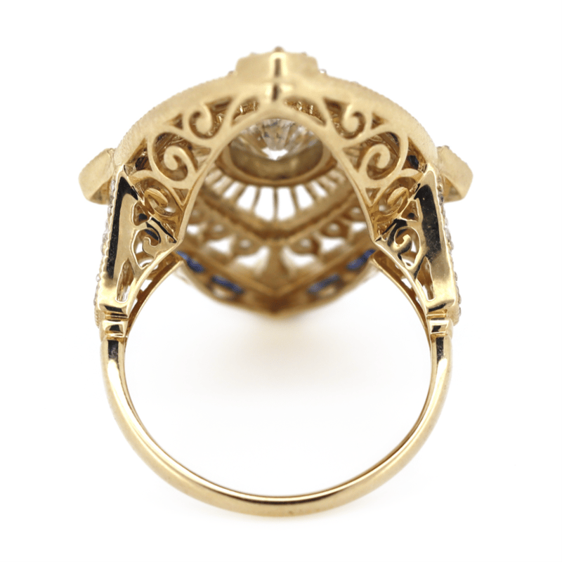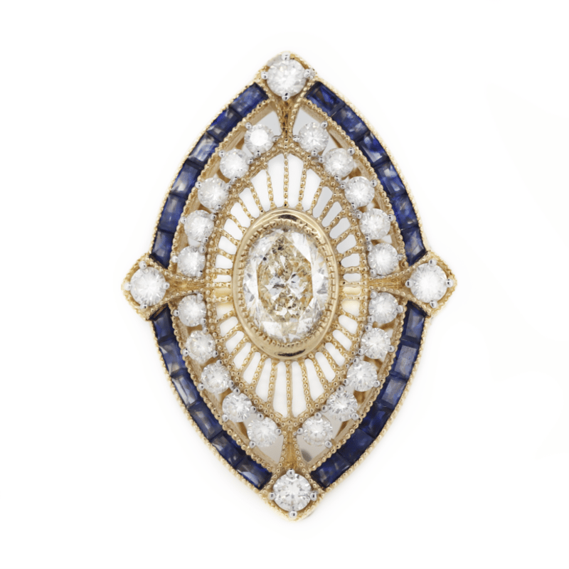The Centre Design Features, One Oval Modified Brilliant Cut, Diamond (1.51Ct, K-L Colour, P2-P3 Clarity), Bezel Set With Millegrain Detail. Surrounding The Centre Are, 24 French Square Cut, Deep Blue, Sapphires (1.11Ct Tsw, Slightly Included), Channel Set. Encompassing The Design Are, 32 Round Brilliant Cut, Diamonds (1.39Ct Tdw, H-K Colour, P2+ Clarity), Bead Set. Ring Size P 1/2.