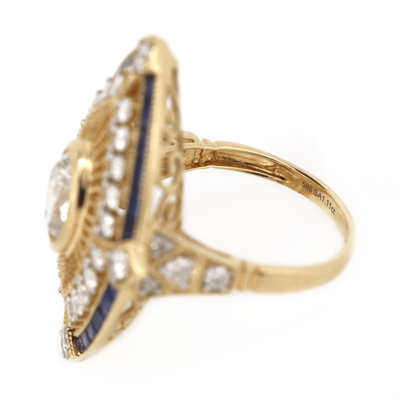 14K YELLOW GOLD, BLUE SAPPHIRE AND DIAMOND, ART DECO RING.
