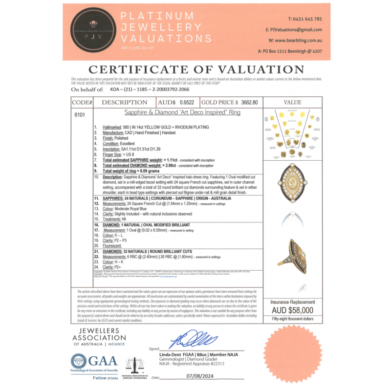 This Insurance Valuation has been provided by a registered Jewellery Valuer and is intended for insurance purposes only. The valuation amount has no bearing on the auction value of the item. Any questions regarding the valuation should be directed to the issuing Valuer (refer to contact details on the certificate) as Lloyds have no association or relationship with the Valuer or the valuation amount contained within the valuation.