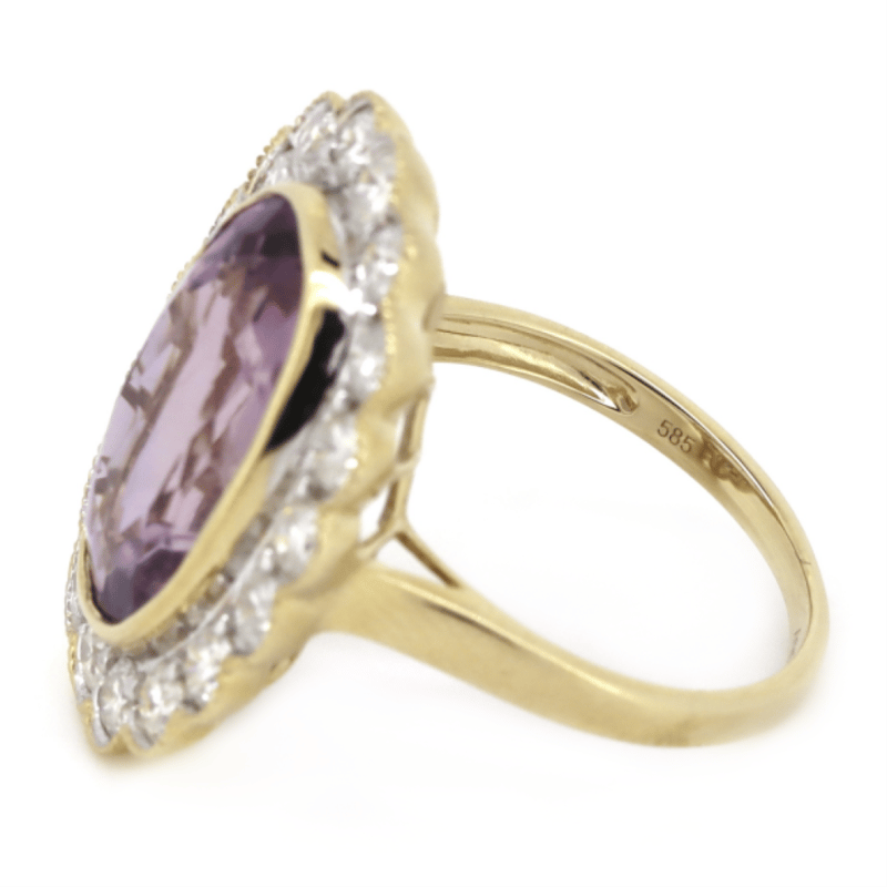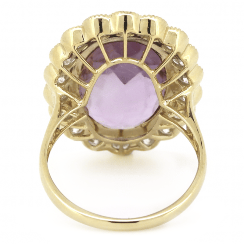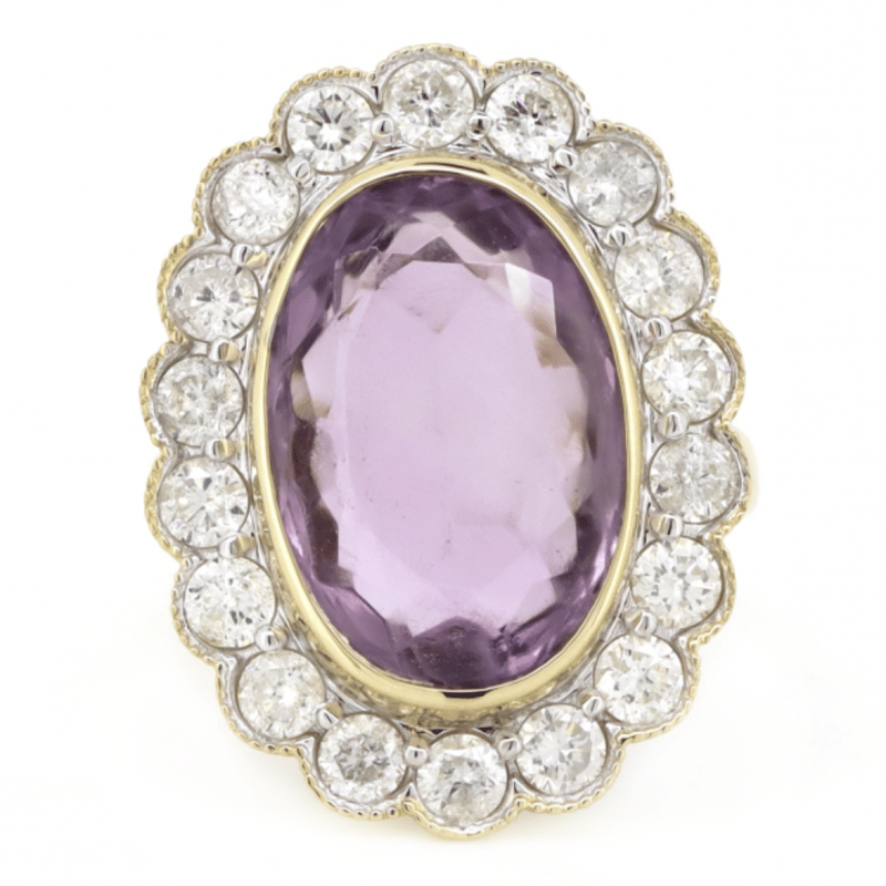 The Centre Features, One Oval Cut, Light Purple, Amethyst (9.86Ct, Minor Eye Visible Inclusions), Bezel Set. Surrounding The Centre In A Halo Are, 18 Round Brilliant Cut, Diamonds (2.38Ct Tdw, H-K Colour, P2+ Clarity), Semi-Bezel/Bead Set In White Gold With Millegrain Detail. Ring Size Q.