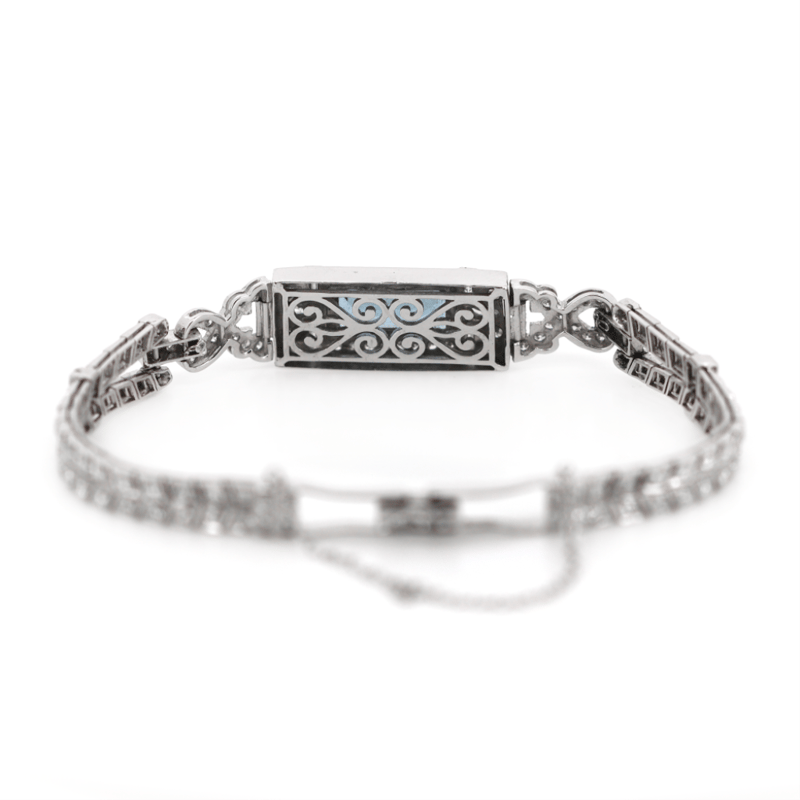 The Centre Features, One Baguette Cut, Deep Moderate Blue, Aquamarine (2.31Ct, Slightly Included), 4 Claw Set. Embellishing The Design Are, 130 Round/Baguette Cuts, Diamonds (2.00Ct Tdw, G-H Colour, Si1-Si2 Clarity), Bezel/Bead Set With Millegrain Detail. The Bracelet Has A Fold Over Clasp With Safety Catch Attached. The Bracelet Length Is 17.5Cm.