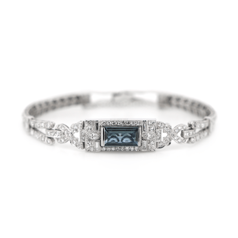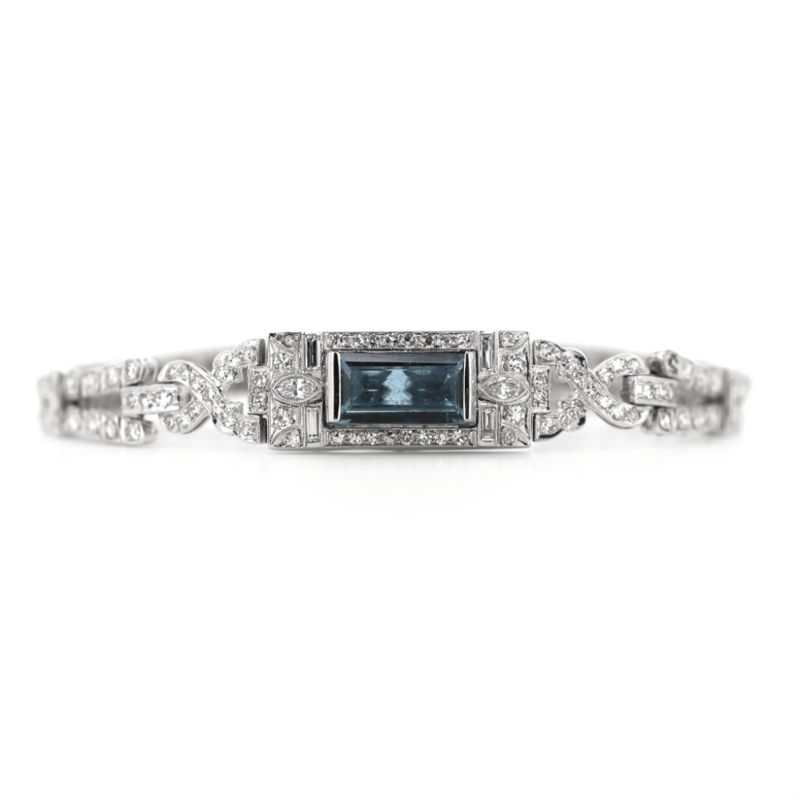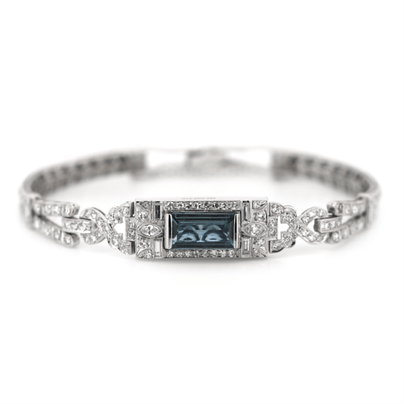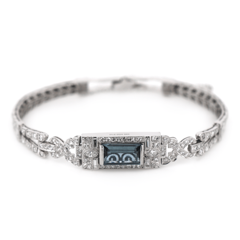 14K WHITE GOLD, AQUAMARINE AND DIAMOND, ART DECO INSPIRED BRACELET.