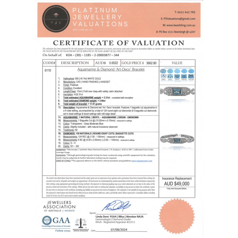 This Insurance Valuation has been provided by a registered Jewellery Valuer and is intended for insurance purposes only. The valuation amount has no bearing on the auction value of the item. Any questions regarding the valuation should be directed to the issuing Valuer (refer to contact details on the certificate) as Lloyds have no association or relationship with the Valuer or the valuation amount contained within the valuation.