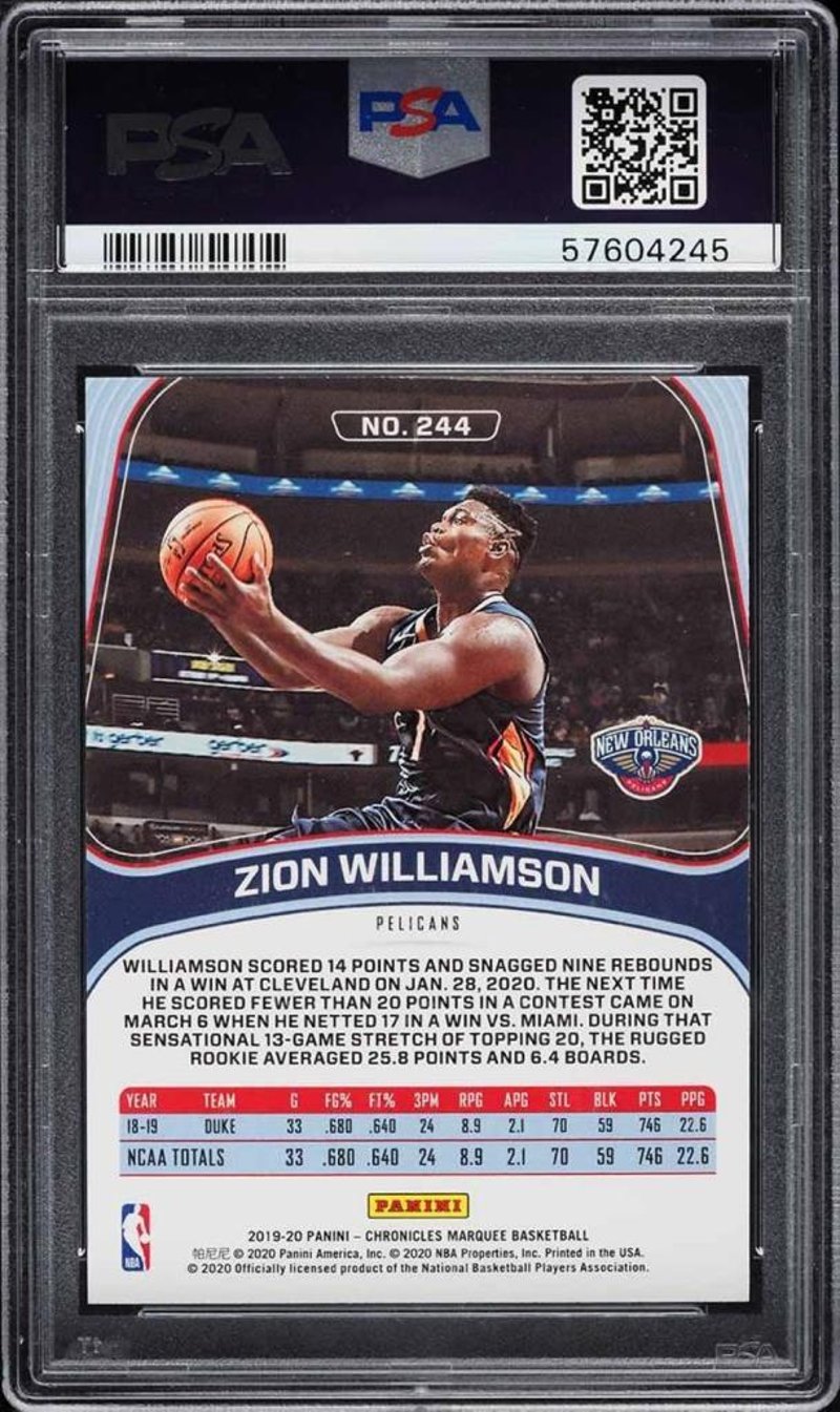 2019 PANINI CHRONICLES MARQUEE ZION WILLIAMSON ROOKIE CARD #244 – PSA 9 MINT