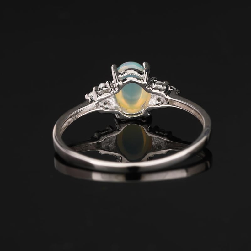 Indulge in the captivating allure of this exquisite ring, where the mystical beauty of an Ethiopian Opal meets the radiant sparkle of white diamonds. At the center of this luxurious piece lies a stunning oval cabochon opal, measuring 7x5mm, showcasing a kaleidoscope of colors that dance with every movement, evoking the enchanting landscapes of its origin. Each glimmering facet reveals a symphony of vibrant hues, from fiery oranges to serene blues, making it a true statement piece for the discerning collector.