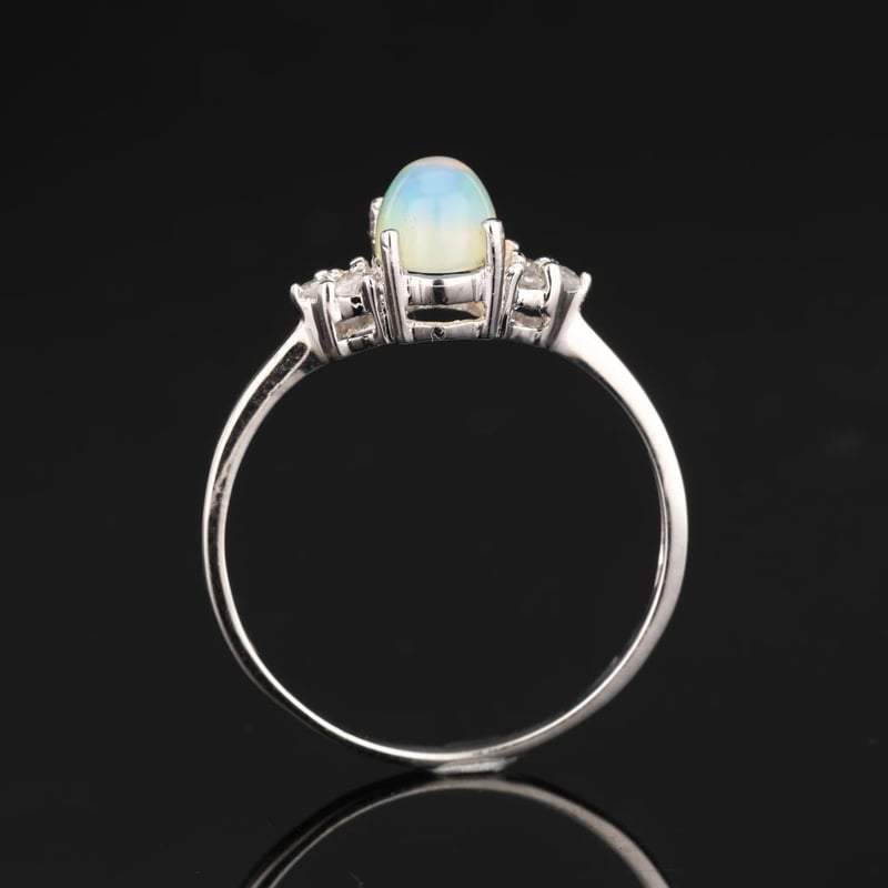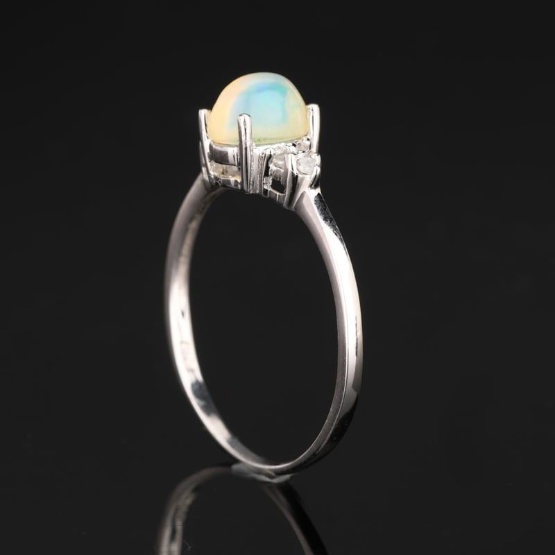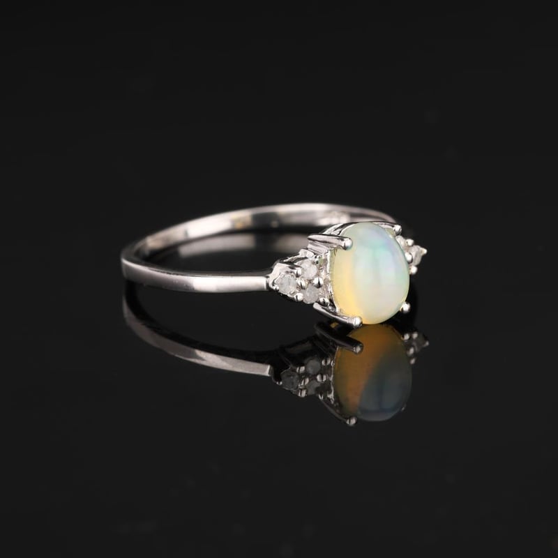 Surrounding the opal, six shimmering round white diamonds, each 1.30mm in size, are meticulously set to enhance the opal's ethereal glow. These diamonds not only add a touch of brilliance but also create a striking contrast that elevates the overall elegance of the ring. Crafted with precision and artistry, this piece is a testament to fine jewelry, designed to be cherished for generations.