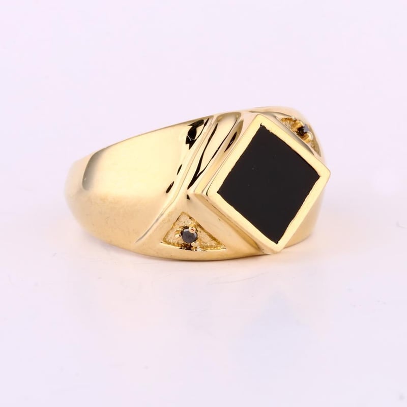 Step into a realm of sophistication with this exquisite ring, perfectly blending boldness and elegance. At its heart lies a striking 8.00mm square black onyx, renowned for its deep, velvety hue that exudes a sense of mystery and allure. Flanking this commanding centerpiece are two shimmering 1.50mm round black diamonds, each meticulously set to catch the light and enhance the ring's overall brilliance.