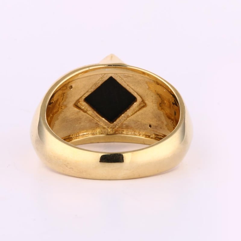 Crafted with precision, this piece is a celebration of modern design and timeless style. The contrast of the smooth onyx against the scintillating black diamonds creates an eye-catching statement that is both captivating and refined. Whether worn as a standalone piece or as part of a layered look, this ring is destined to become a cherished addition to any jewelry collection.