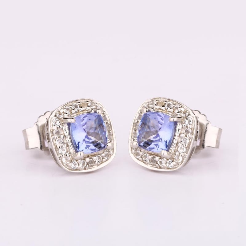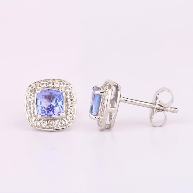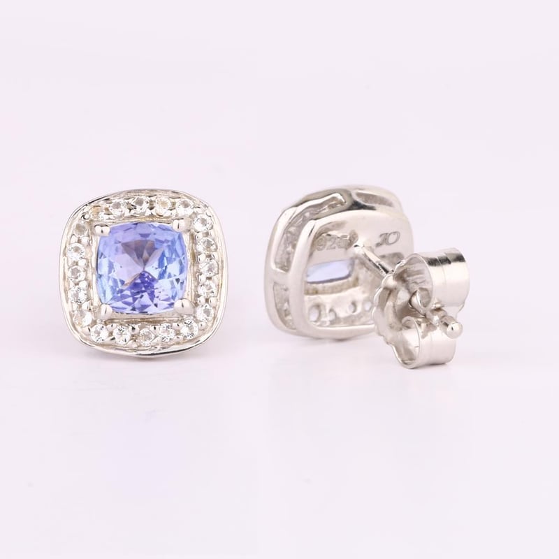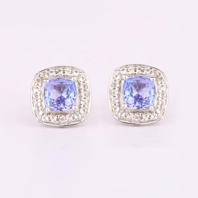 Indulge in the ethereal beauty of these exquisite earrings, where sophistication meets elegance. Featuring two stunning cushion-cut Lavender Tanzanite stones, each measuring 5.00mm, these gems radiate a mesmerizing hue that captures the essence of twilight skies. Their soft lavender tones are beautifully complemented by the brilliant sparkle of 40 round White Topaz stones, each 1.00mm, delicately encircling the tanzanite, enhancing their allure with luminous brilliance.